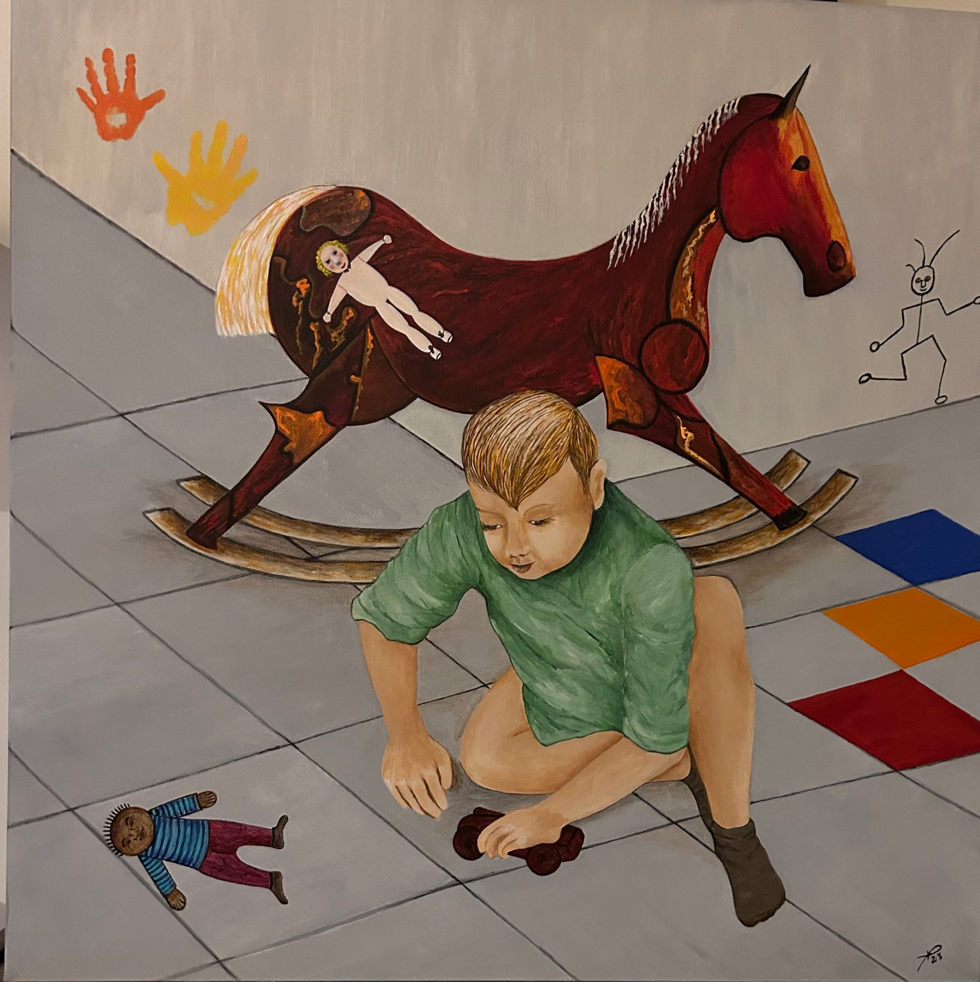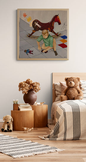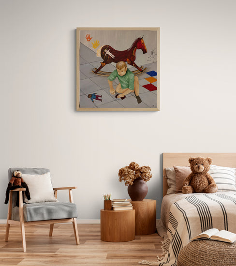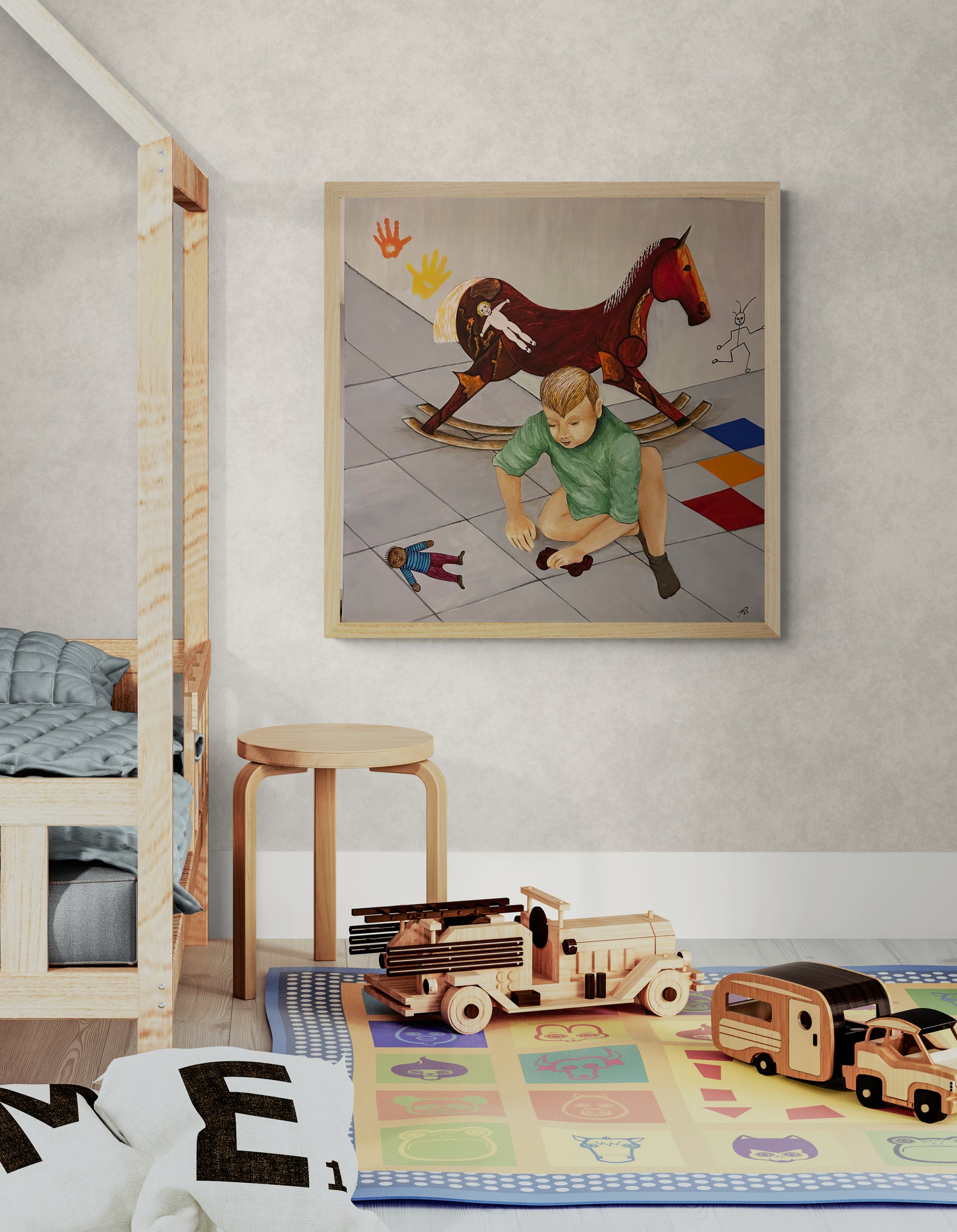 This artwork depicts a child immersed in play, surrounded by nostalgic symbols of childhood. A vintage wooden rocking horse with deep red and brown hues stands in the background, featuring cracks and signs of wear, suggesting the passage of time.