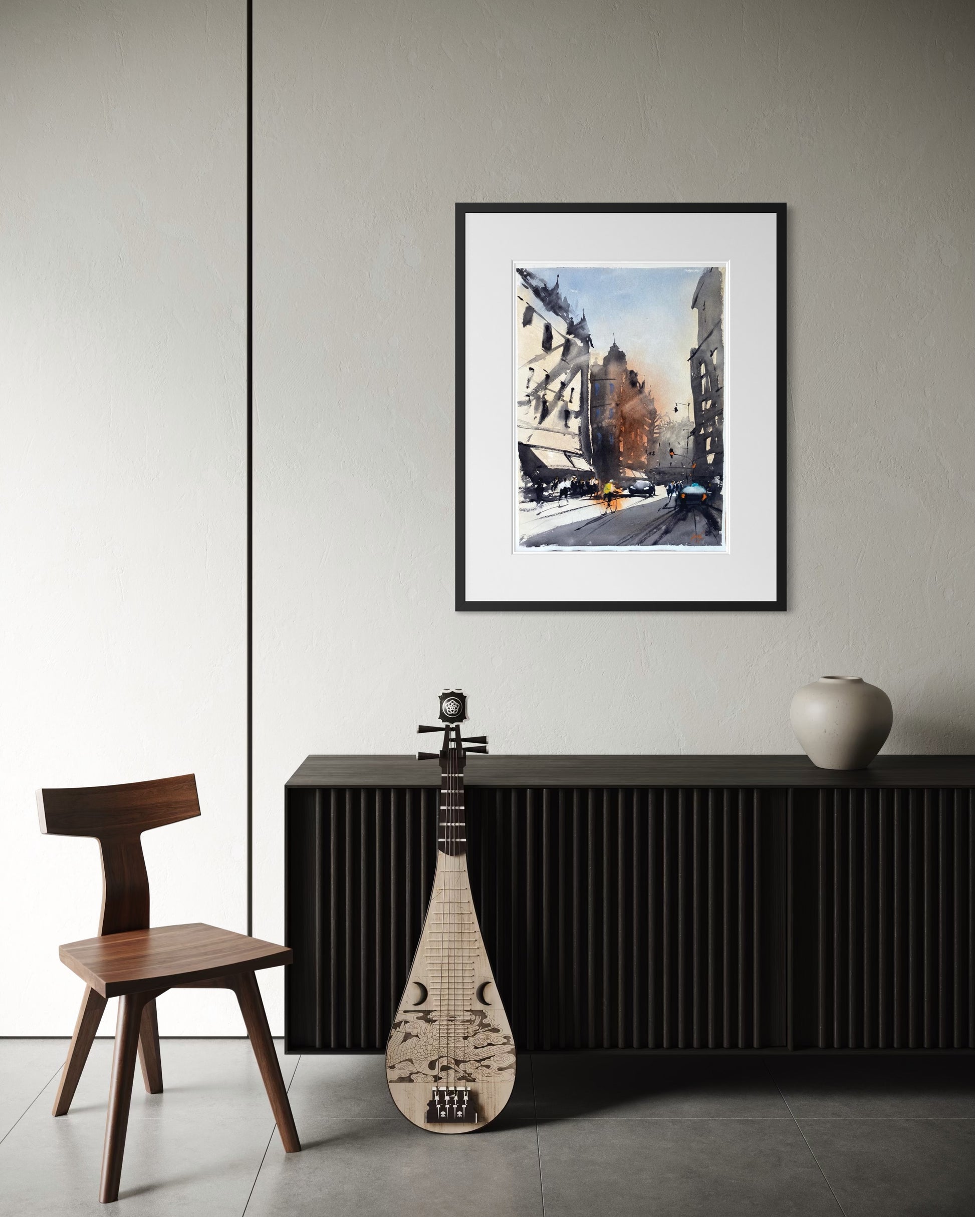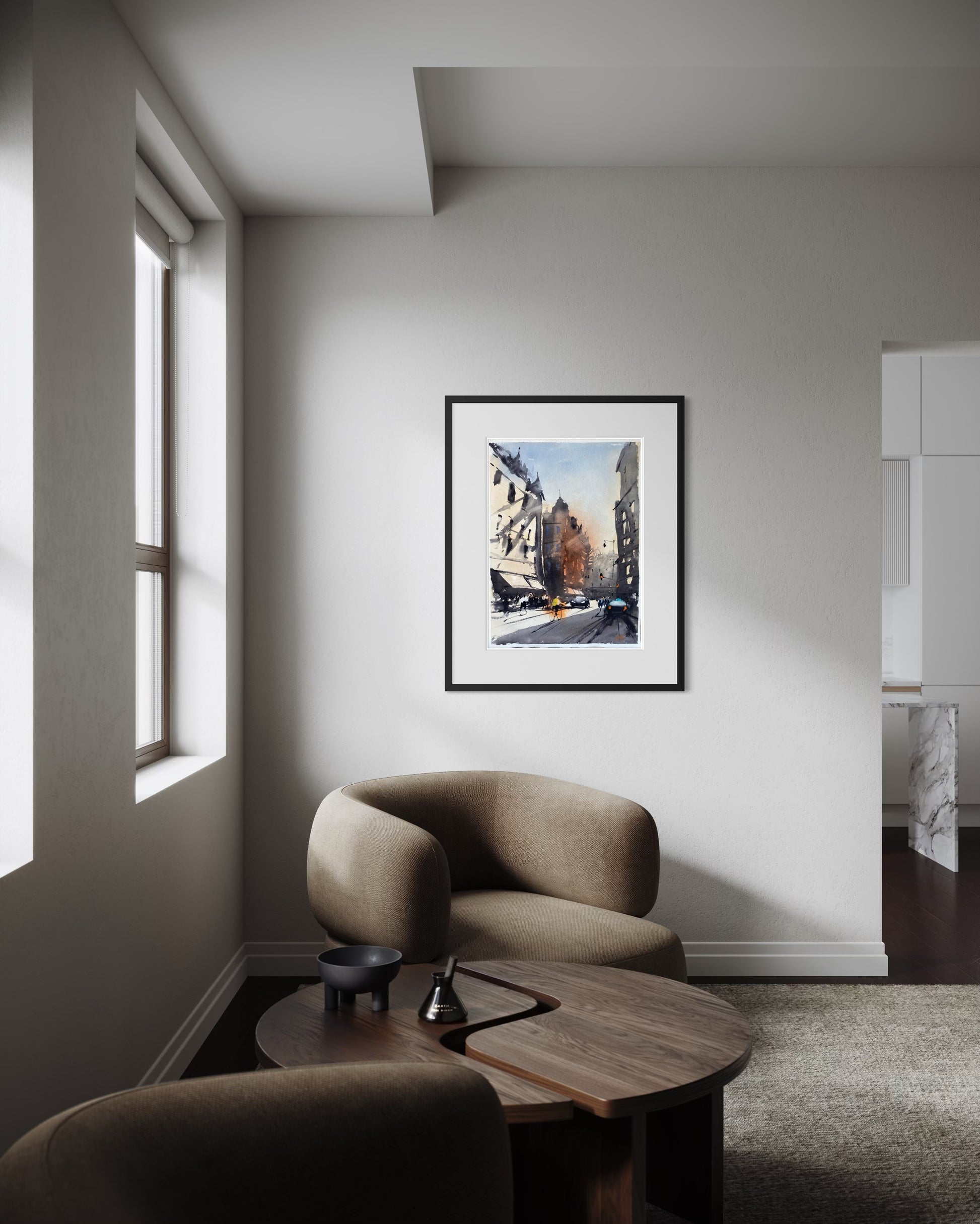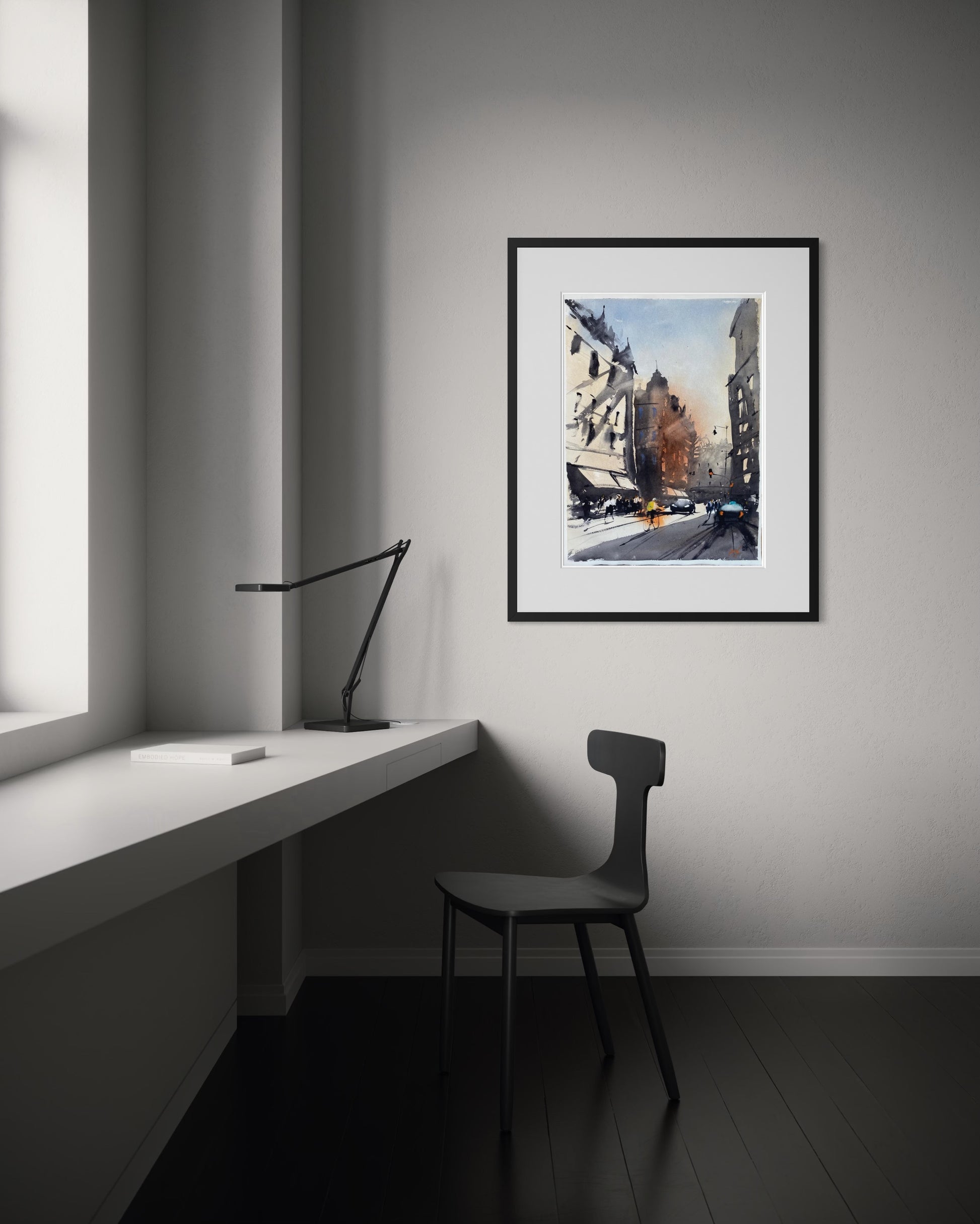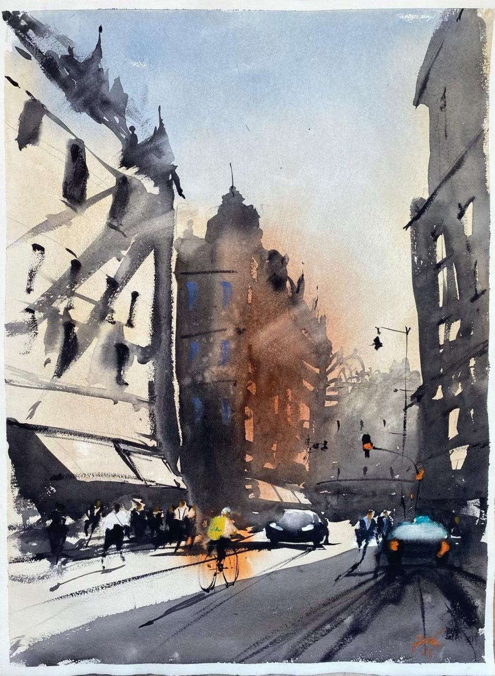 In this watercolor, the street is a stage of gentle collision—between light and stone, movement and stillness, solitude and collective presence. The cyclist, illuminated in yellow, becomes the quiet anchor of the scene, a pulse of human persistence amidst the sweeping blur of a city always in transition.