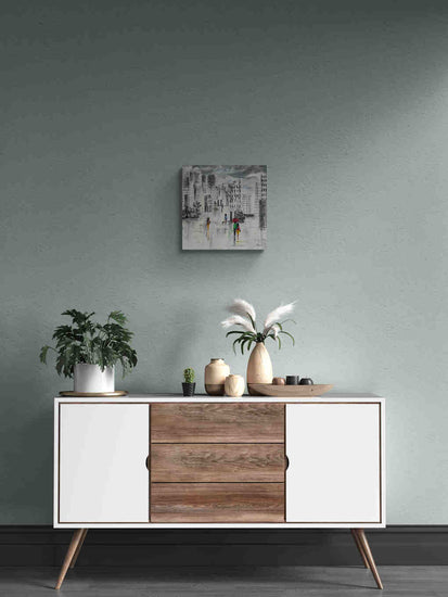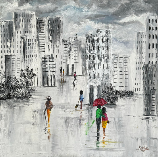 This painting depicts a rainy day in a sepia-toned city where reflections shimmer on the wet streets. Figures in vibrant colors provide a stark contrast against the subdued backdrop of the urban environment. The artist’s use of the palette knife technique to create a textured surface brings depth and realism to the cityscape, accentuating the wet sheen of the streets and the gritty texture of the buildings. This technique lends a sense of immediacy and dynamism to the city scene, capturing the fleeting nature of everyday urban life.