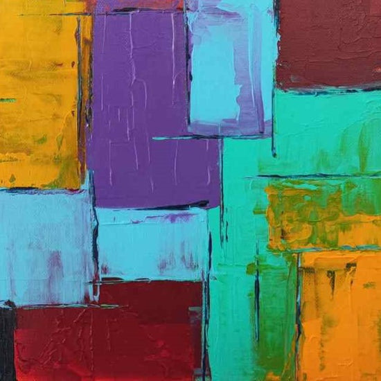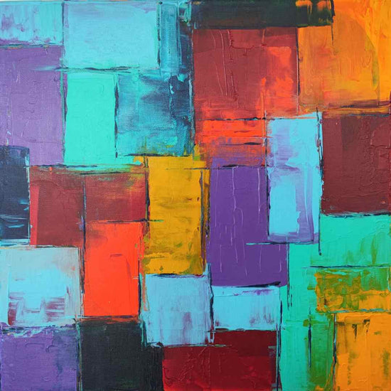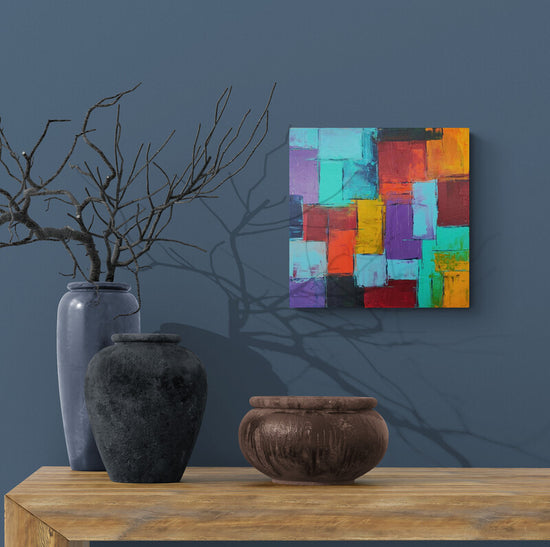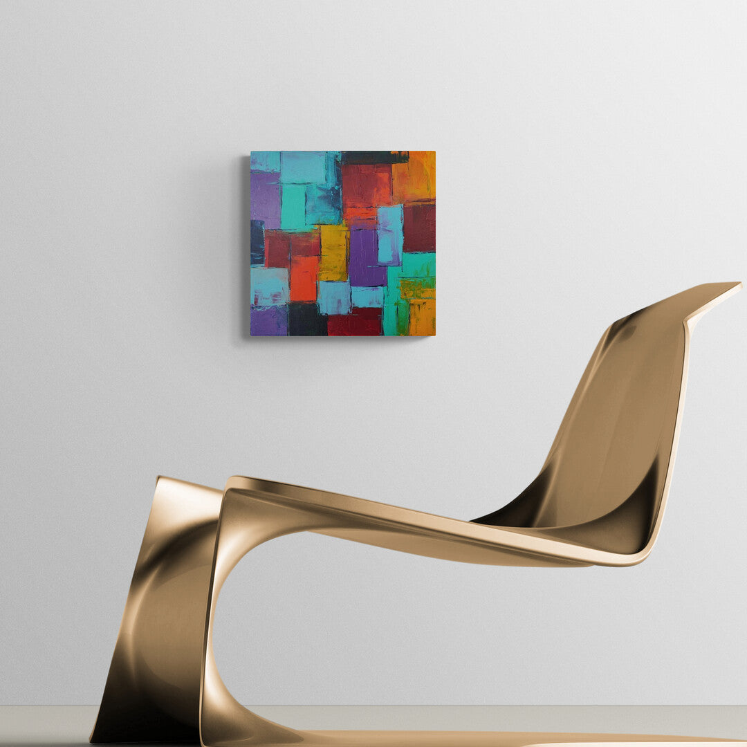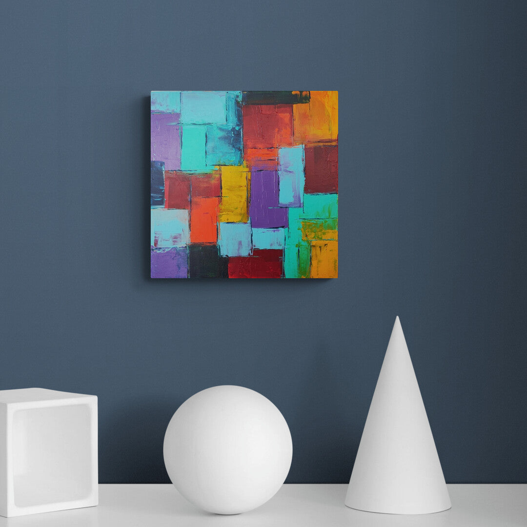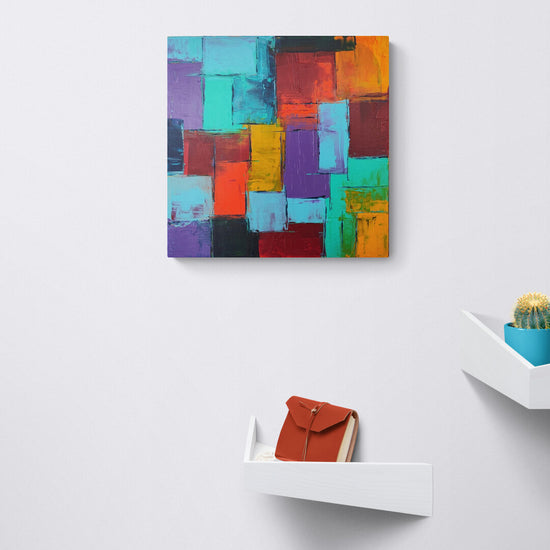 A joyful abstract composition that bursts with energy and vibrancy. This artwork features a playful arrangement of bold hues—turquoise, purple, orange, and yellow—layered in geometric forms.