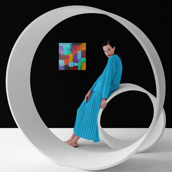 Its dynamic design and uplifting palette make it an eye-catching piece for brightening any contemporary space.