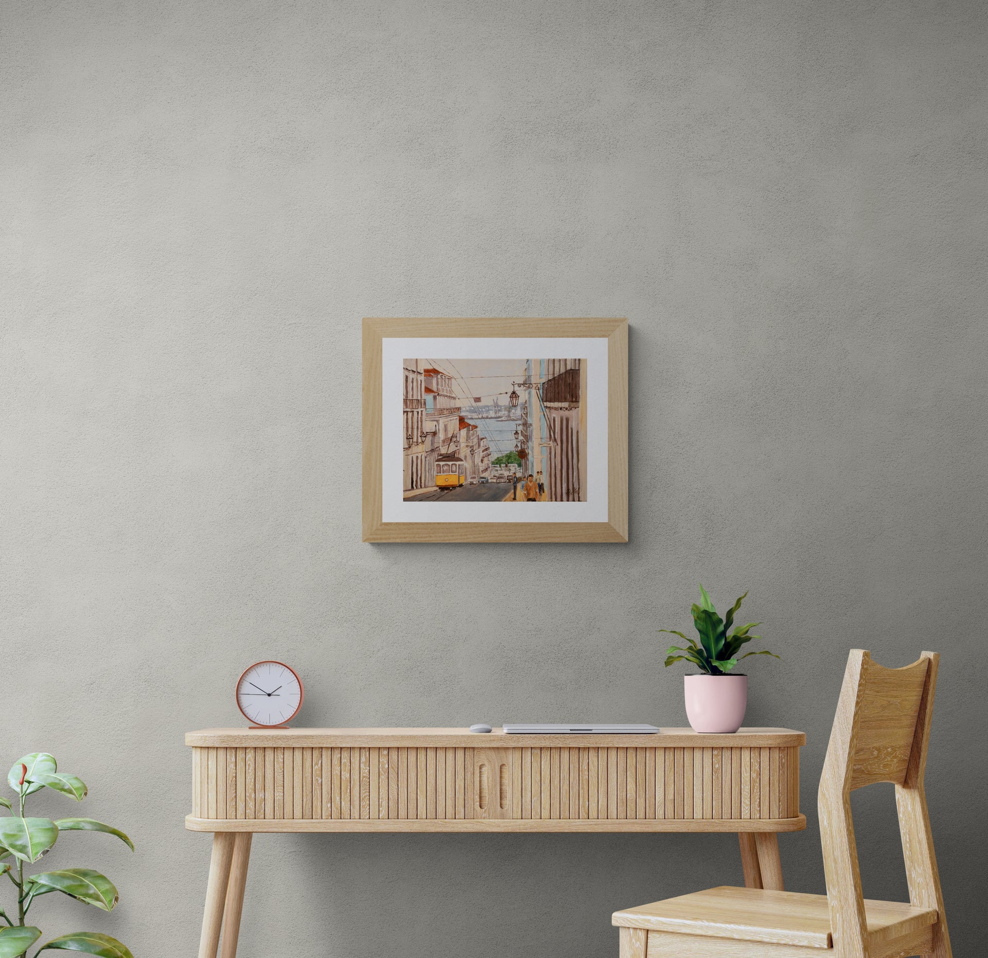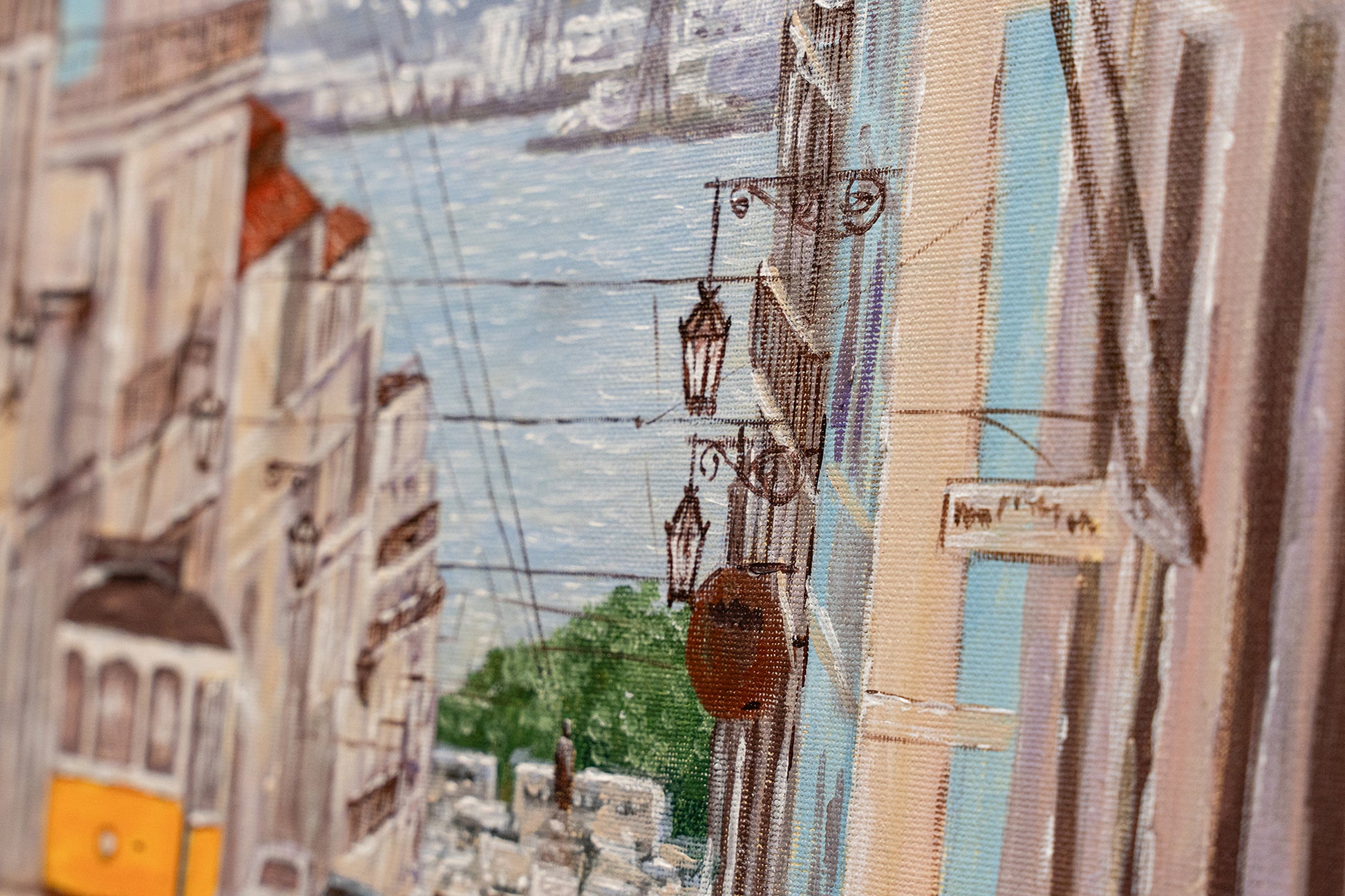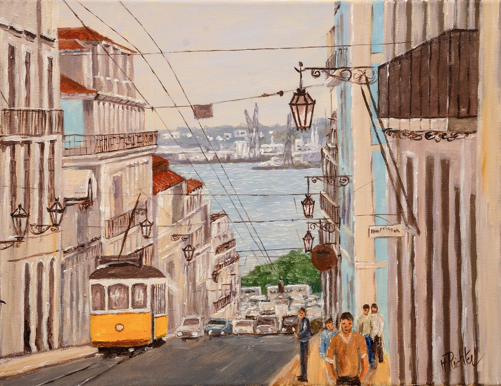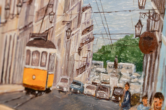 A bustling cityscape captures the everyday motion with a classic tram gliding along, flanked by elegant buildings under a soft, expansive sky, as pedestrians go about their day.