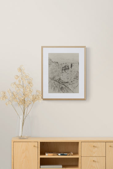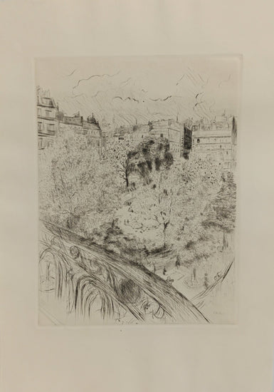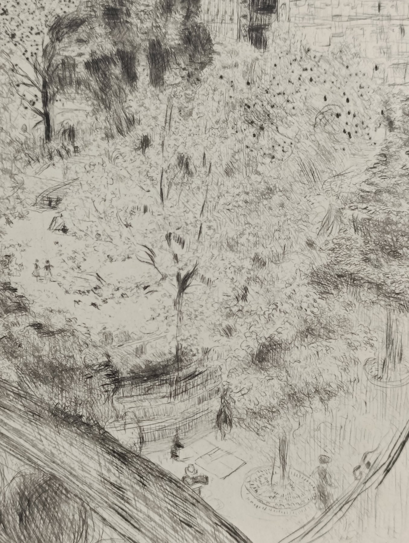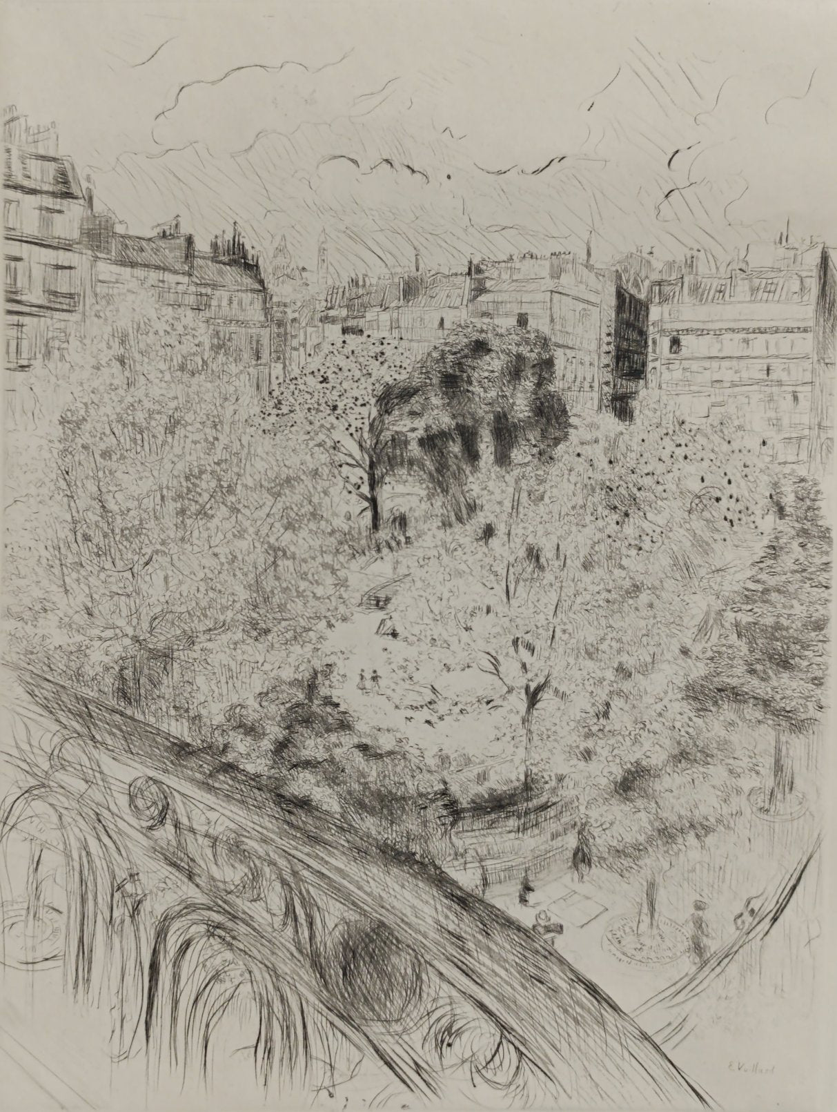 This etching, created by Jean-Édouard Vuillard, offers an intimate view of a Parisian cityscape from a balcony. With finely detailed lines, Vuillard captures the architectural elegance of the surrounding buildings and the lushness of the trees below. The perspective invites the viewer into the scene, as though standing on the balcony and observing the quiet rhythm of city life. The monochromatic palette allows the delicate linework to convey both texture and depth, creating a tranquil yet dynamic portrayal of urban life.