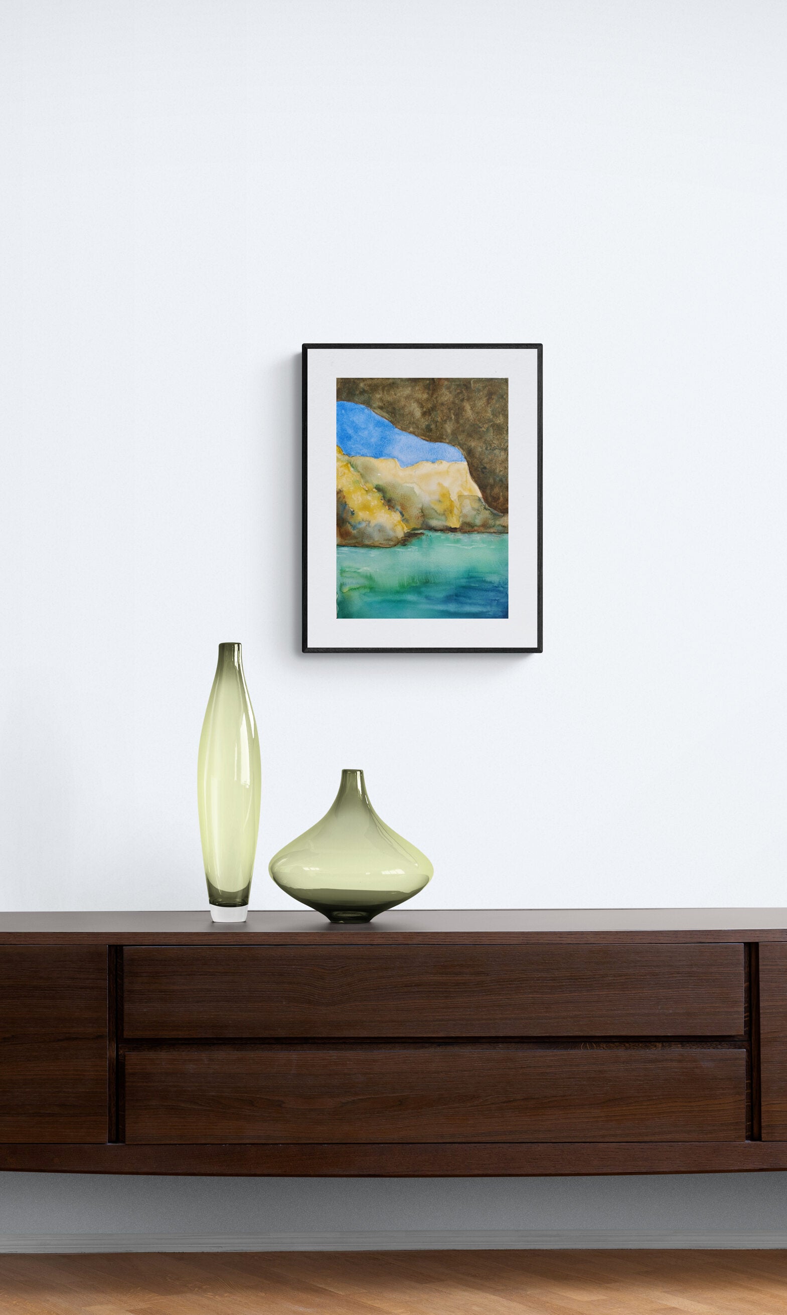 Serene watercolor painting that beautifully captures the natural landscape of towering cliffs meeting the calm, turquoise waters below. The rich earthy tones of the cliffs contrast with the bright blue sky, creating a harmonious balance of warm and cool colors. The artist's delicate use of gradients in the water gives the impression of depth and tranquility, while the textured cliffs add a sense of rugged beauty. This piece evokes a peaceful moment by the seaside, perfect for lovers of nature and coastal landscapes.