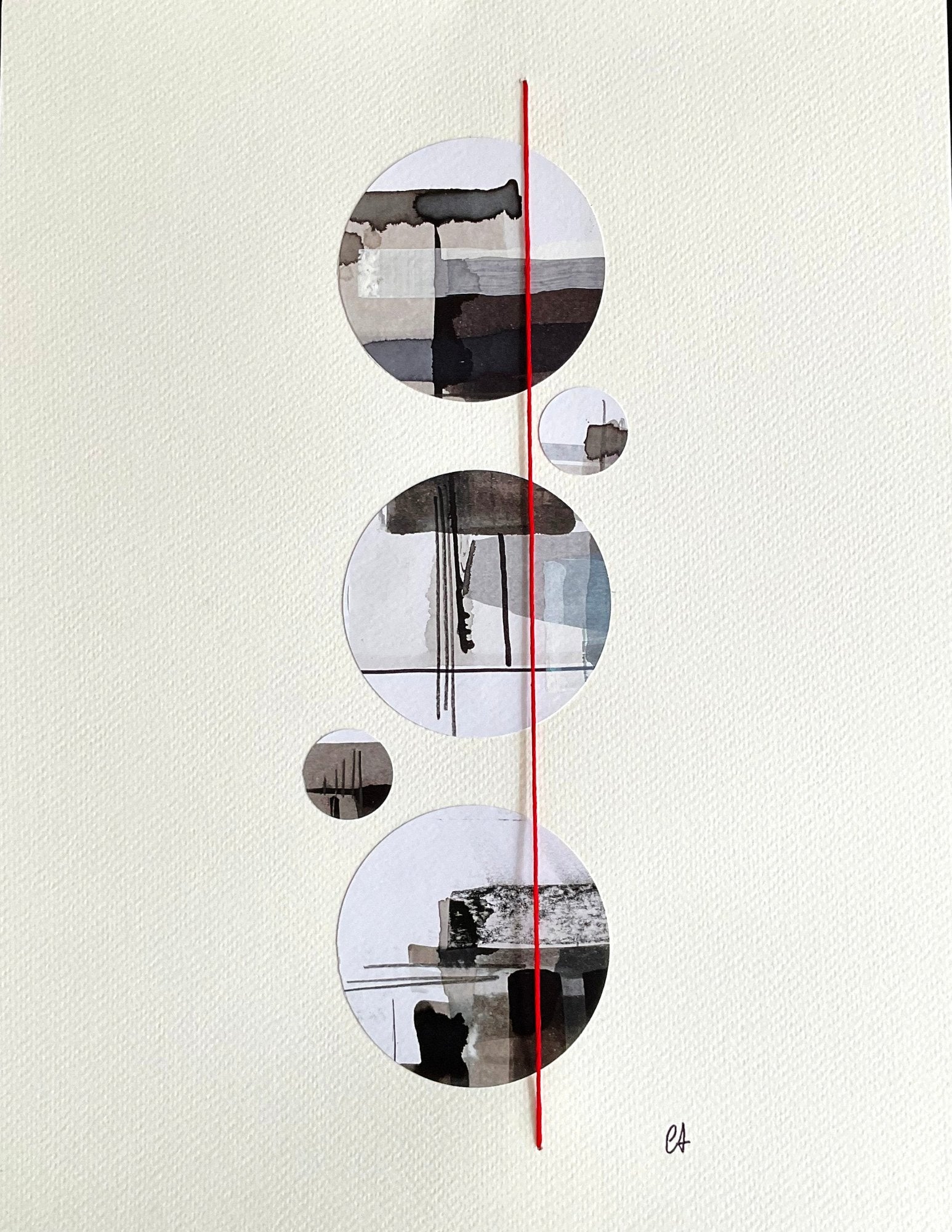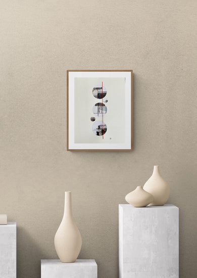 Close Up #8 from the Close Up Series continues the exploration of spatial abstraction through circular compositions and layered imagery. Dominated by muted tones of gray, black, and white, each circle reveals intricate textures and architectural forms that hint at urban landscapes. A bold vertical red line cuts through the artwork, creating a striking contrast and guiding the viewer’s eye from top to bottom. This minimalist yet impactful arrangement invites the observer to pause and reflect on the convergence of shapes and spaces within each circular element.