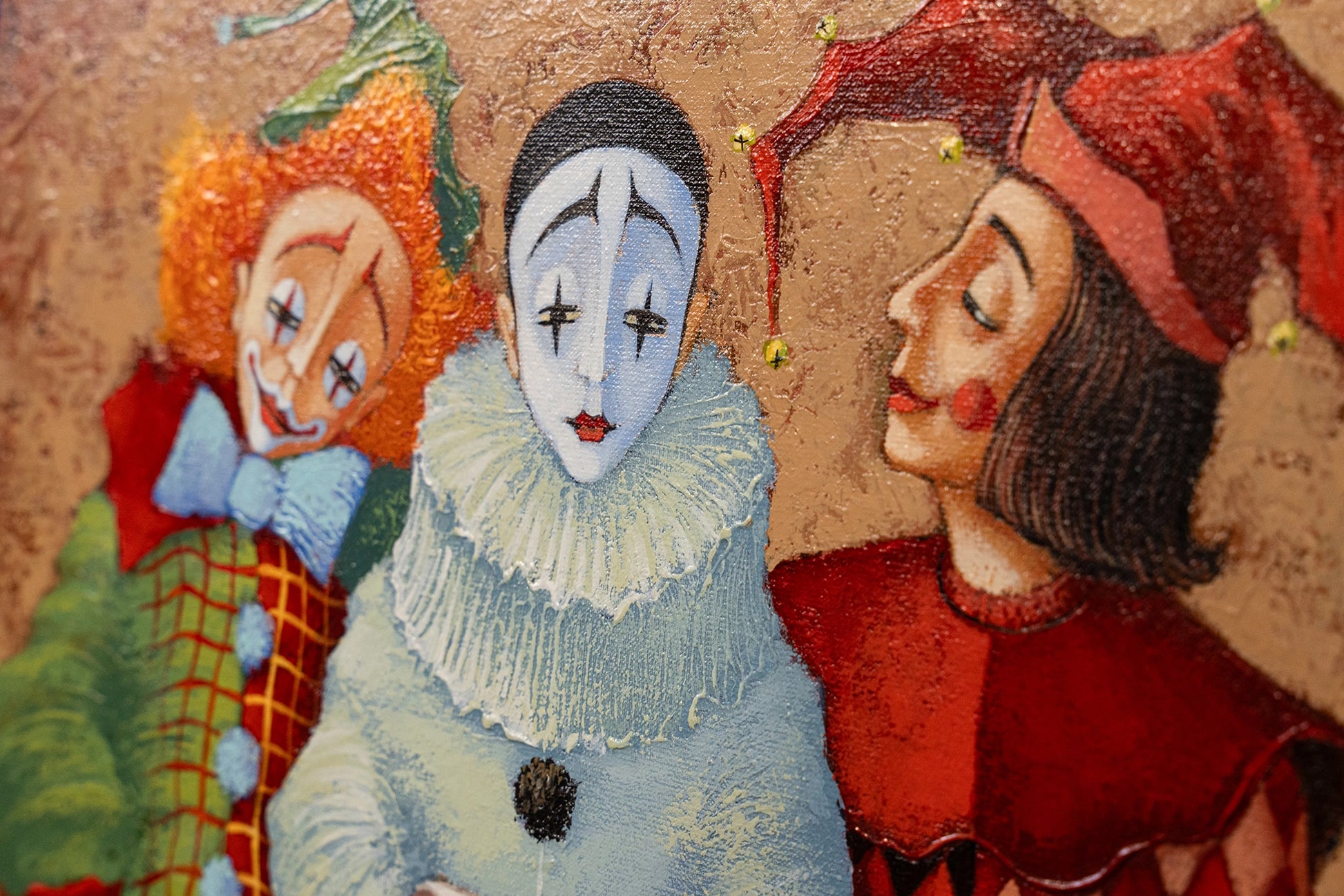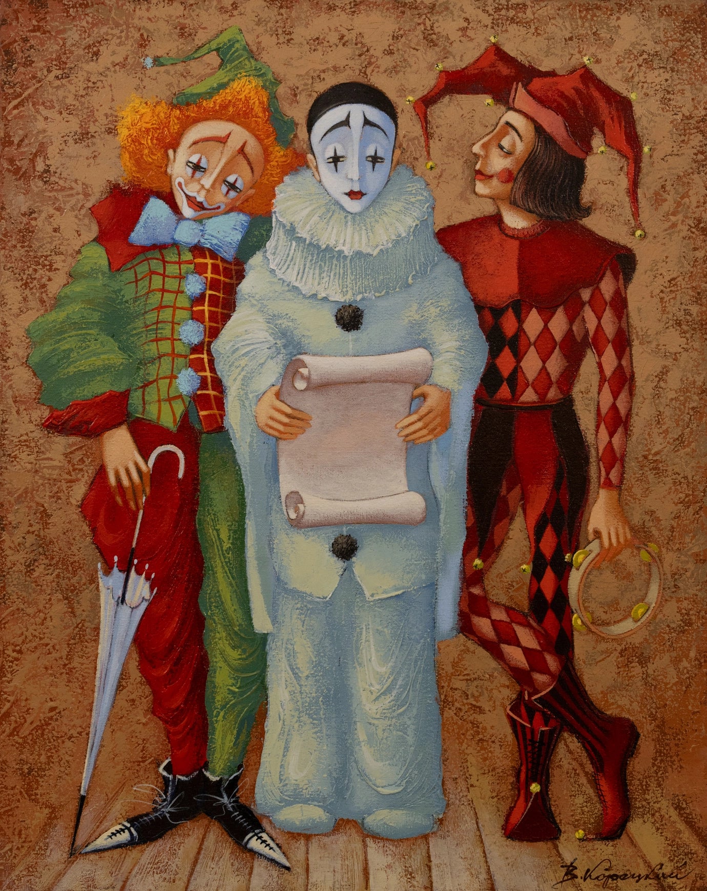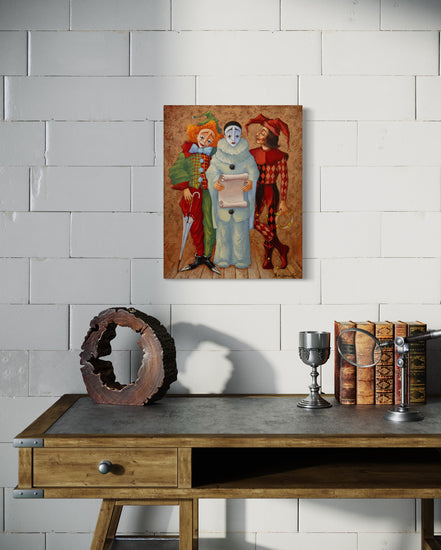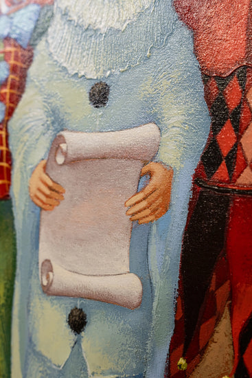 This painting portrays a trio of clowns in a traditional, theatrical style. On the left, a clown with a ruffled collar and pointed hat leans inward, holding a sword; the central figure, draped in blue with a ruffled white collar, presents a blank scroll; and on the right, a clown in a diamond-patterned costume carries a tambourine.
