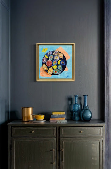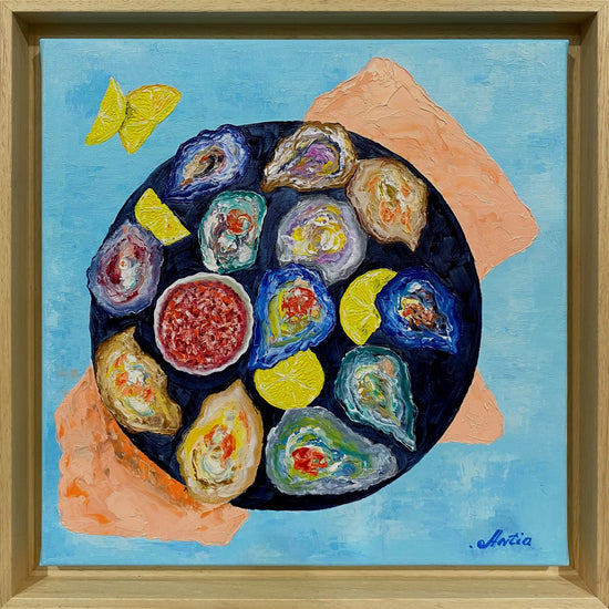 The vibrant textures and colors of this painting, focusing on a display of oysters complemented by lemon wedges. Each oyster shell, with its unique color variation, seems to echo the ocean’s depths, while the citrus accents add a lively pop of yellow. This piece captures the freshness and joy of coastal dining with a touch of whimsy, inviting viewers to indulge in the sensory experience of this delicacy. The textured paint application enhances the sense of realism and tactile quality, bringing the feast to life.