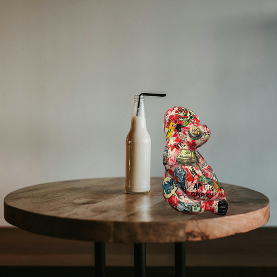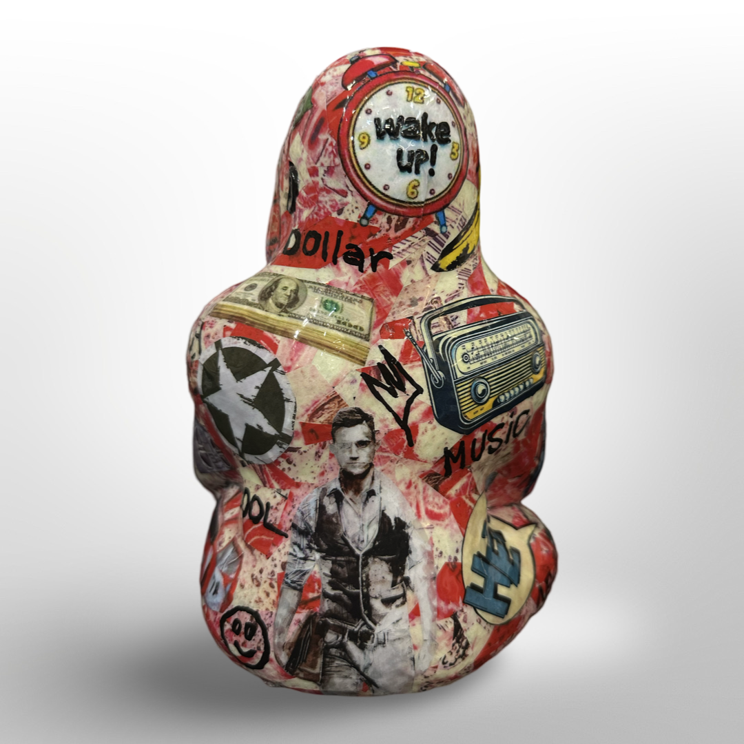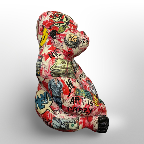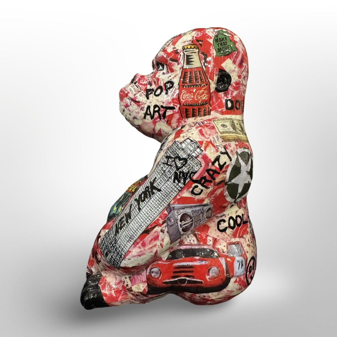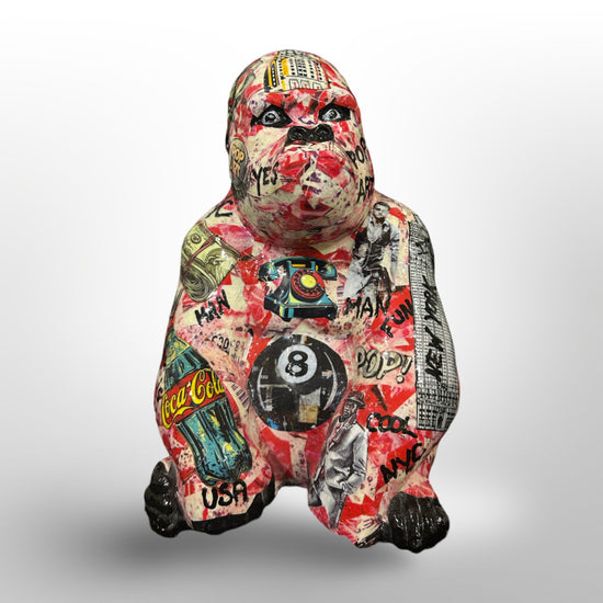 A vibrant and dramatic gorilla sculpture seated and intricately wrapped with an eclectic mix of imagery inspired by pop-art such as popular Coca-Cola logos, vintage images, cityscapes, and playful graphics.