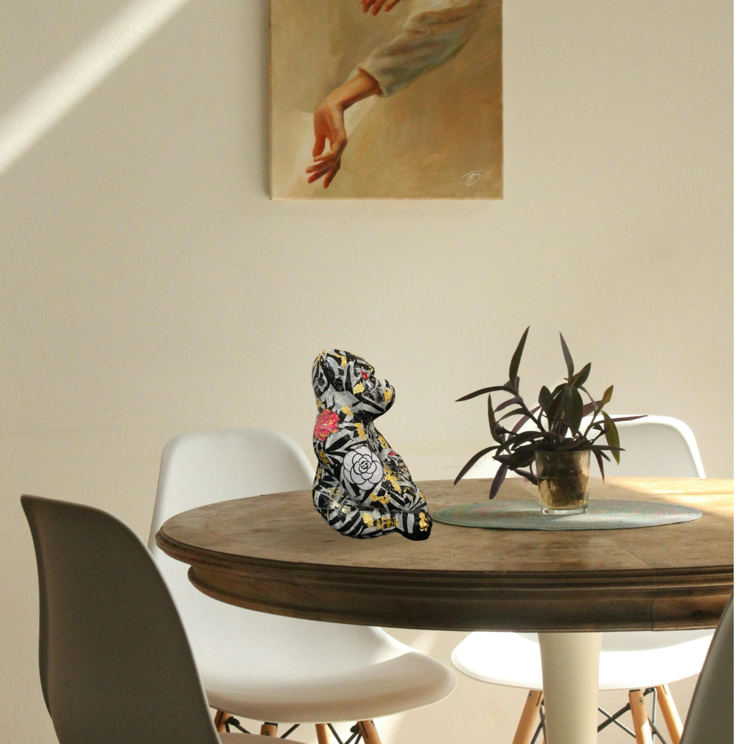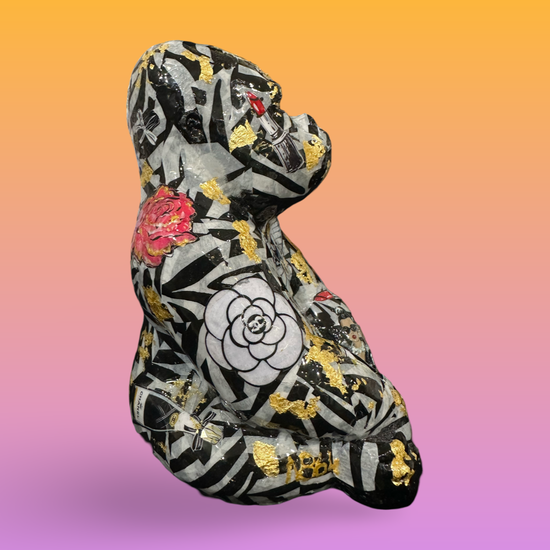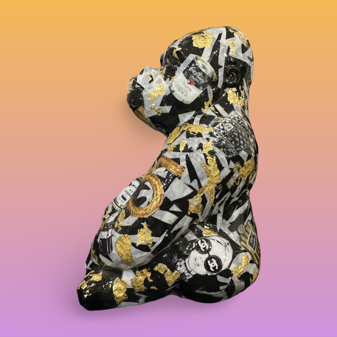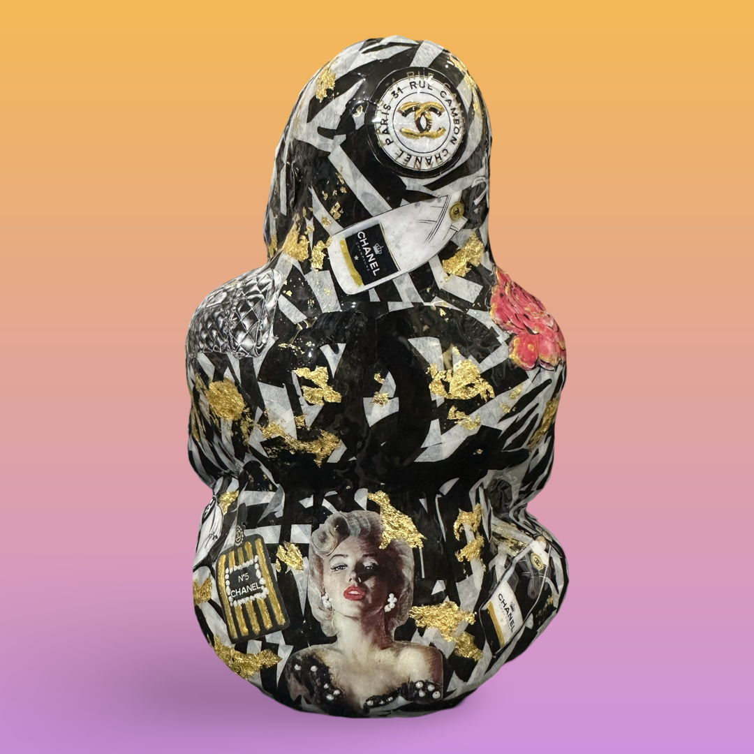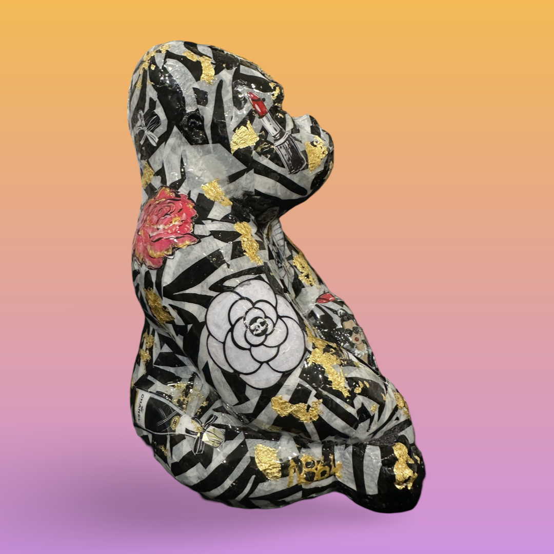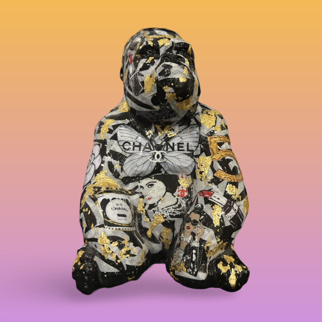 An elegant and luxurious sculpture of a seated gorilla, richly decorated with iconic Chanel branding, fashion imagery, and shimmering gold accents. Blending high-fashion references with street art sensibilities, this piece creates a bold visual statement that highlights both glamour and contemporary pop culture.