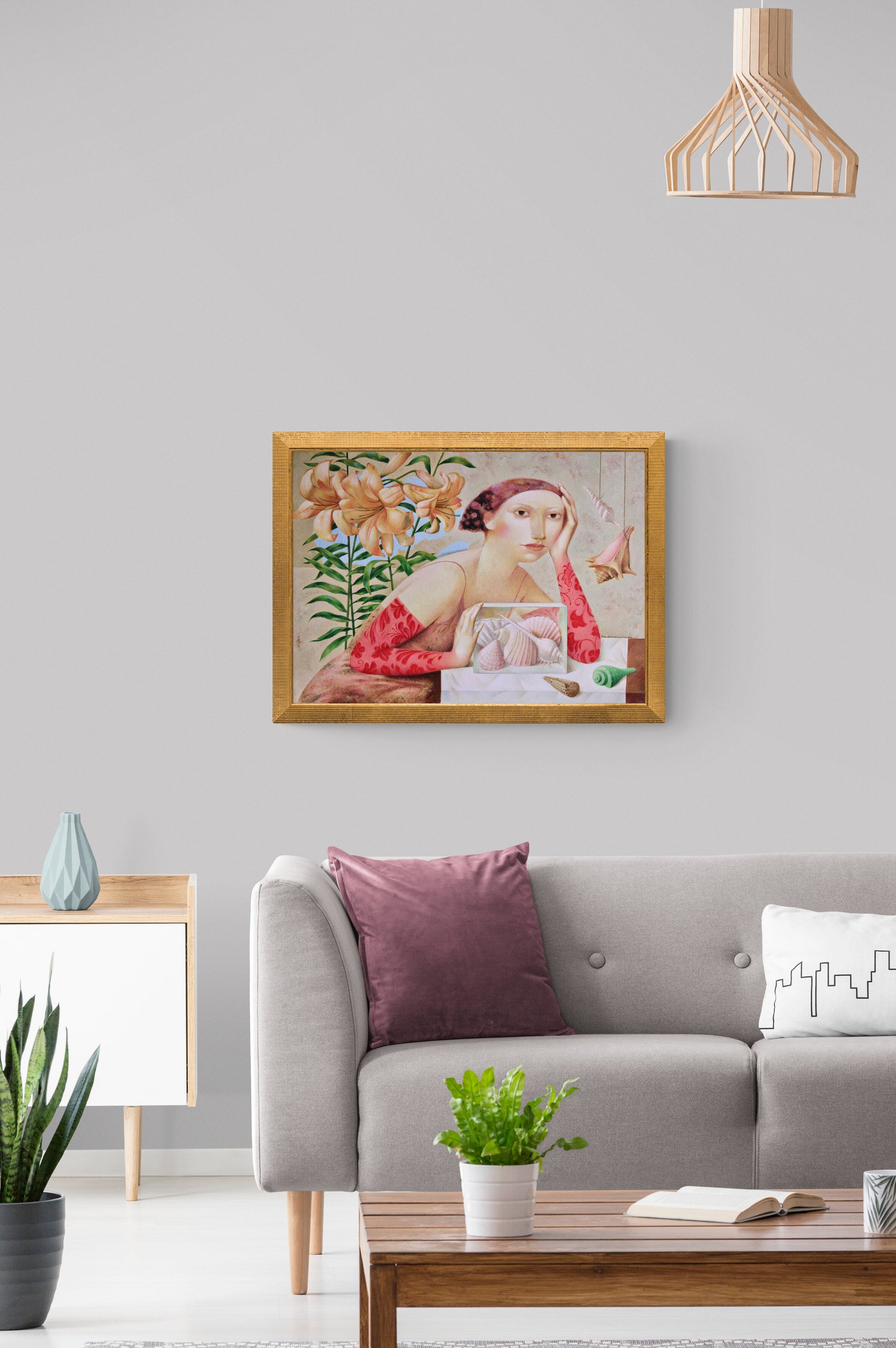 This painting portrays a serene woman deeply immersed in quiet contemplation, as if listening to the silent whispers of the seashells before her. Surrounding her are delicate lilies, their soft petals echoing the grace and fragility of the shells she gently cradles. The intricate patterns on her arm vibrant red florals seamlessly connect her to the natural beauty that envelops her.