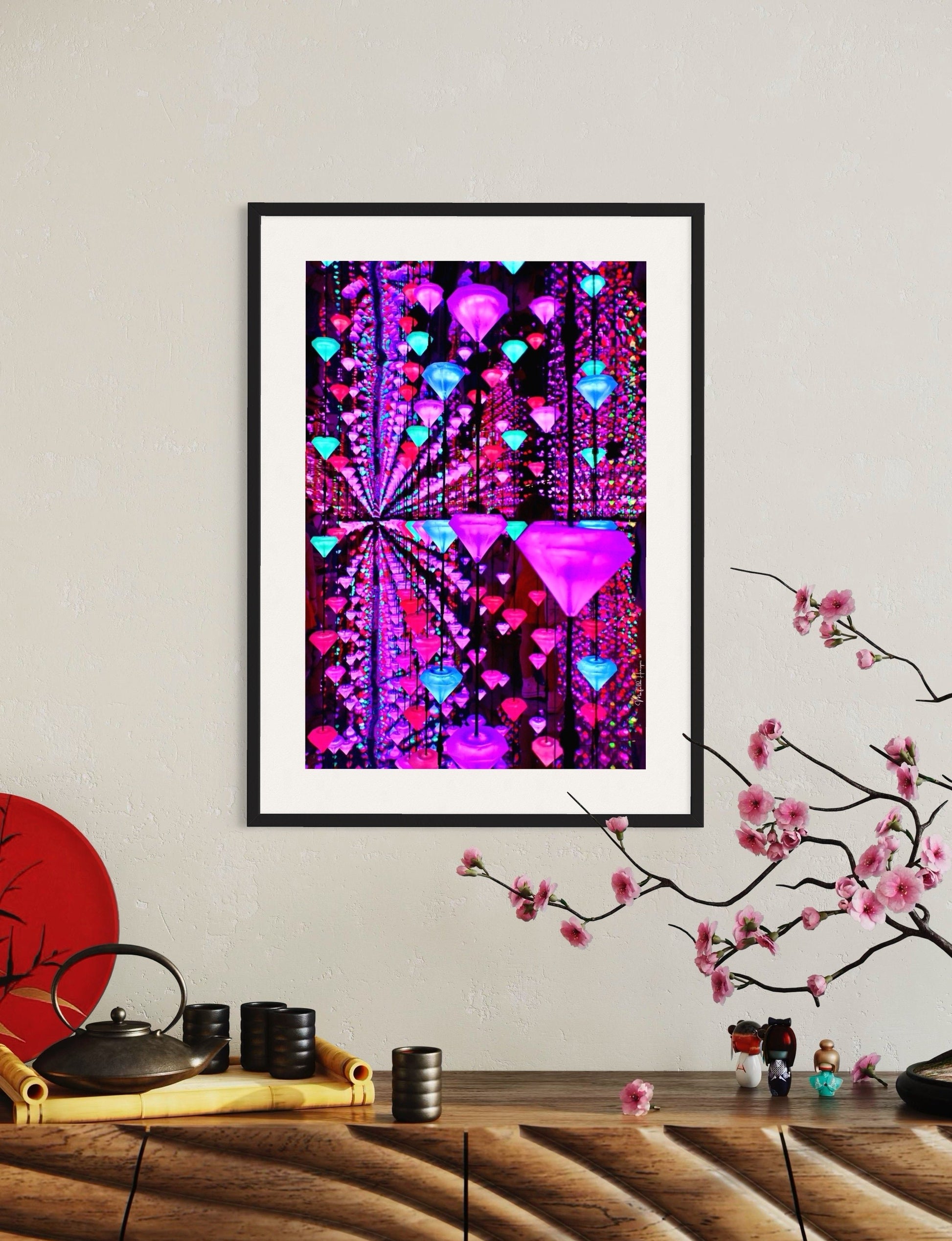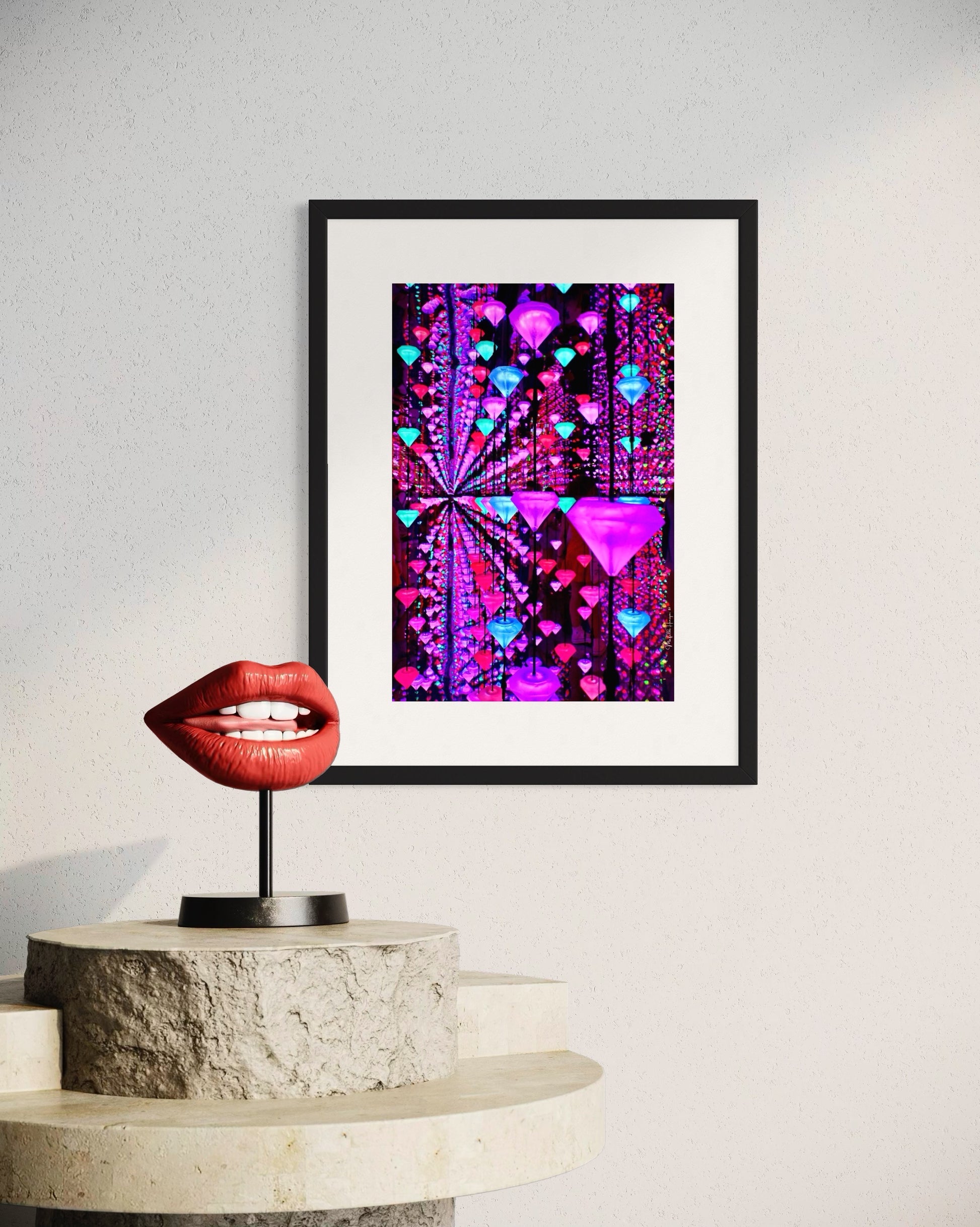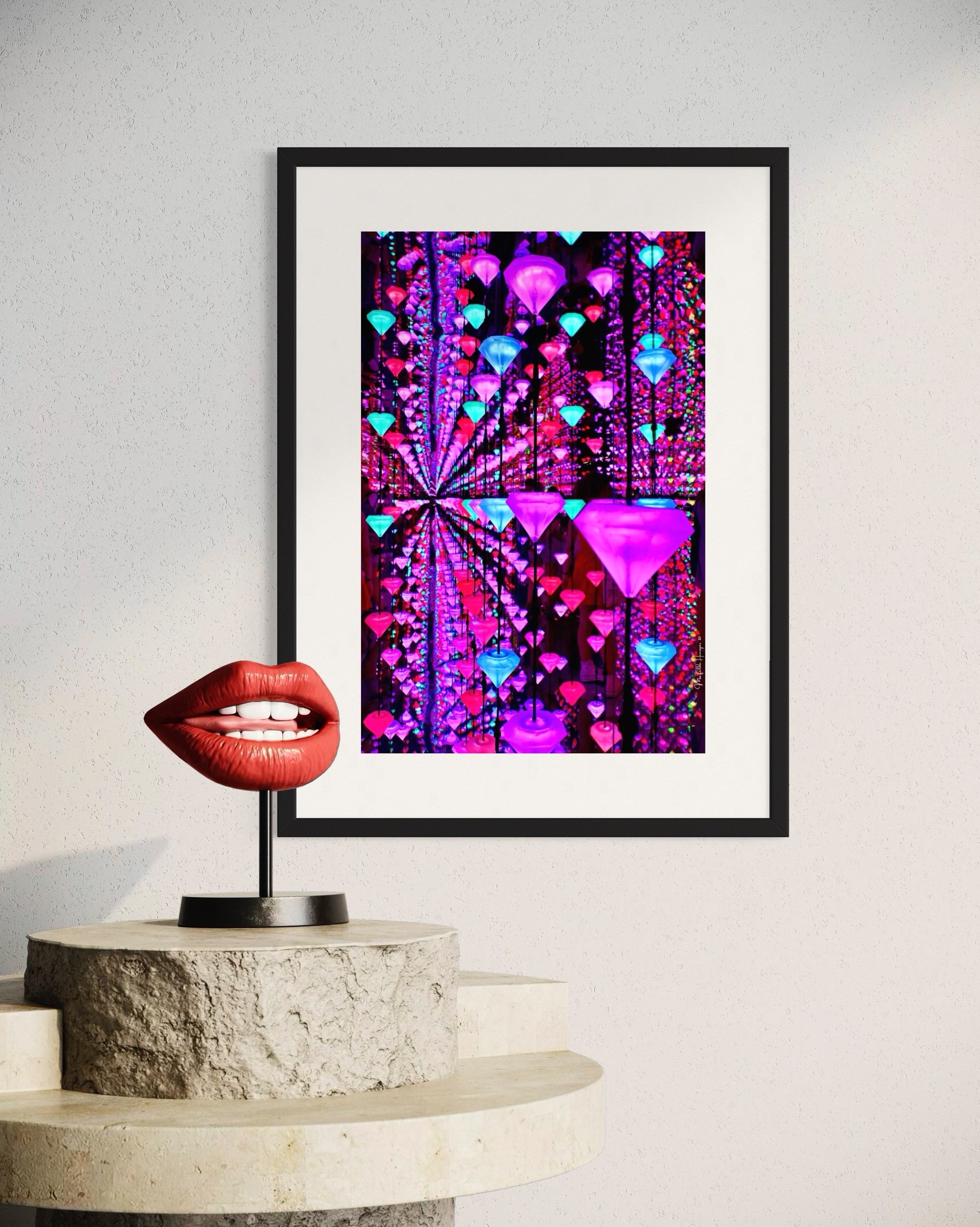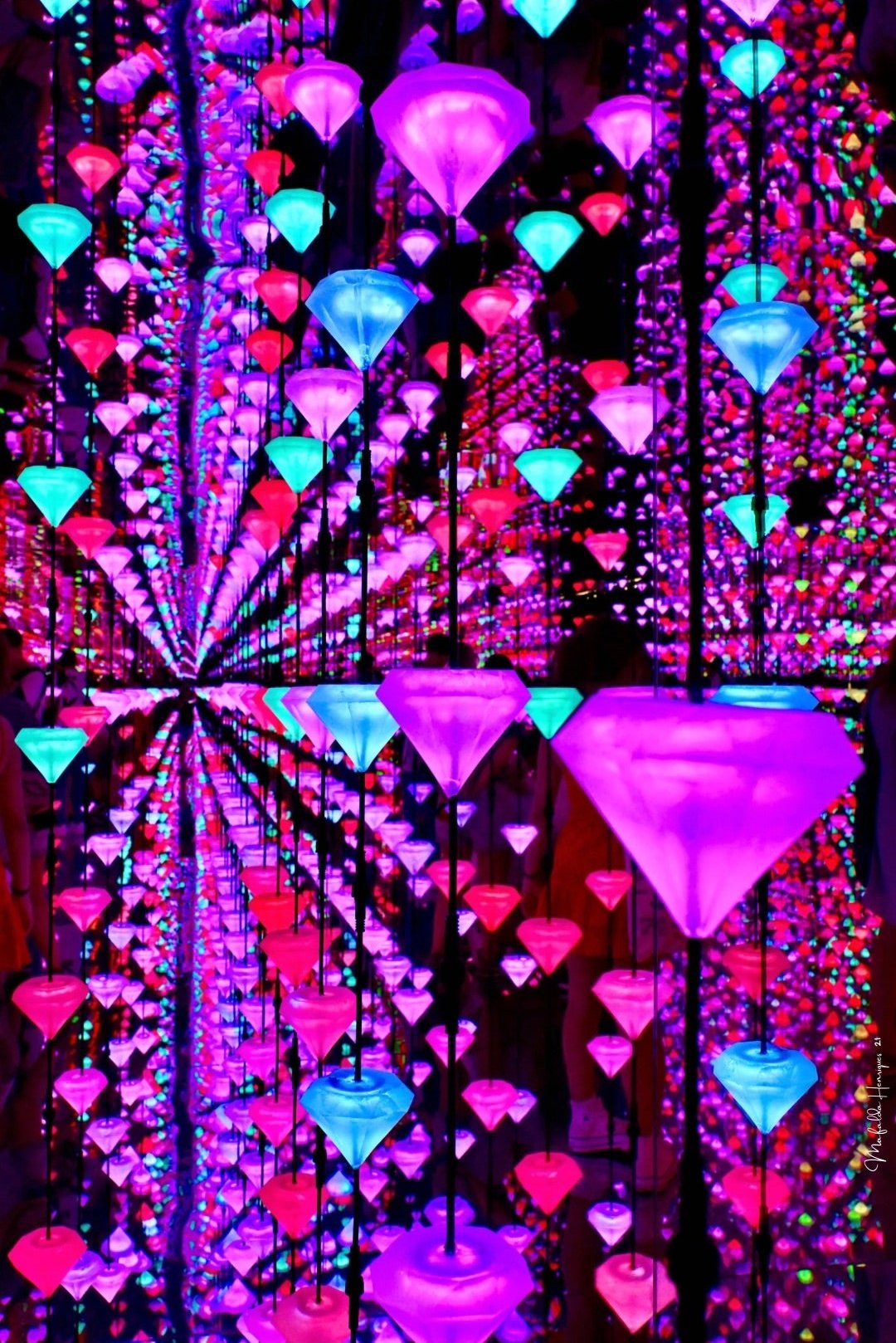 In this image captured at the MOCCO Museum in Barcelona, the viewer is transported to a dimension where reality and imagination blur together. The composition highlights a detail in the right corner of the installation, where soft pink prisms float suspended in the air, infinitely repeated in mirrored reflections. Each prism, with its own gentle light, seems to pulse delicately, conveying a sense of calm and enchantment.