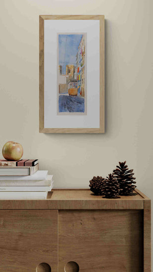 "Colorful Passage" is a vibrant watercolor painting that illustrates a lively street scene, highlighted by the passage of an iconic tram. The painting captures a moment in time on a narrow city street adorned with colorful hanging laundry and rustic architectural details. The tram, bustling with passengers, moves dynamically through the center, offering a glimpse into the everyday urban tapestry. The artist's skilled use of watercolor brings out the vivid colors and textures of the buildings, while the clear sky and detailed cobblestone street add depth and realism to the scene.