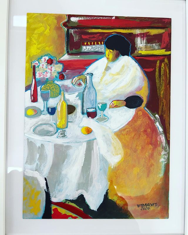 The central figure, wrapped in soft, muted whites and yellows, sits in thoughtful solitude, surrounded by vibrant hues of reds, blues, and yellows that animate the table settings—bottles, glasses, and a vase of flowers.