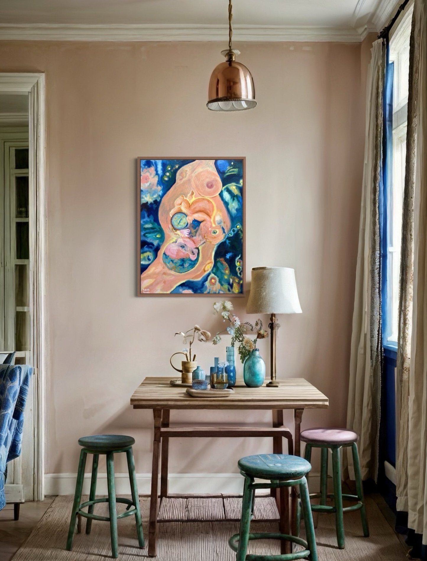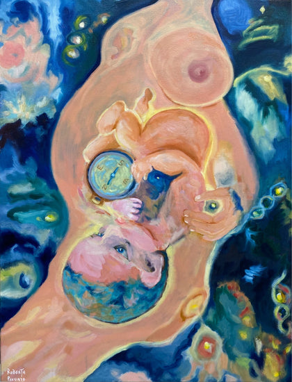 A deeply symbolic and surreal painting, depicting a newborn cradling a compass as if to suggest an intrinsic connection to guidance and purpose. Surrounded by vibrant celestial blues and swirling organic forms, the composition merges the essence of creation and cosmic destiny. The nurturing embrace of the mother’s form provides a sense of safety, while the dreamlike background reflects the vast unknowns of life. This piece by Roberta Pravia invites viewers to contemplate themes of origin, direction, and the mystery of existence.