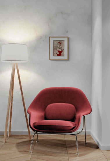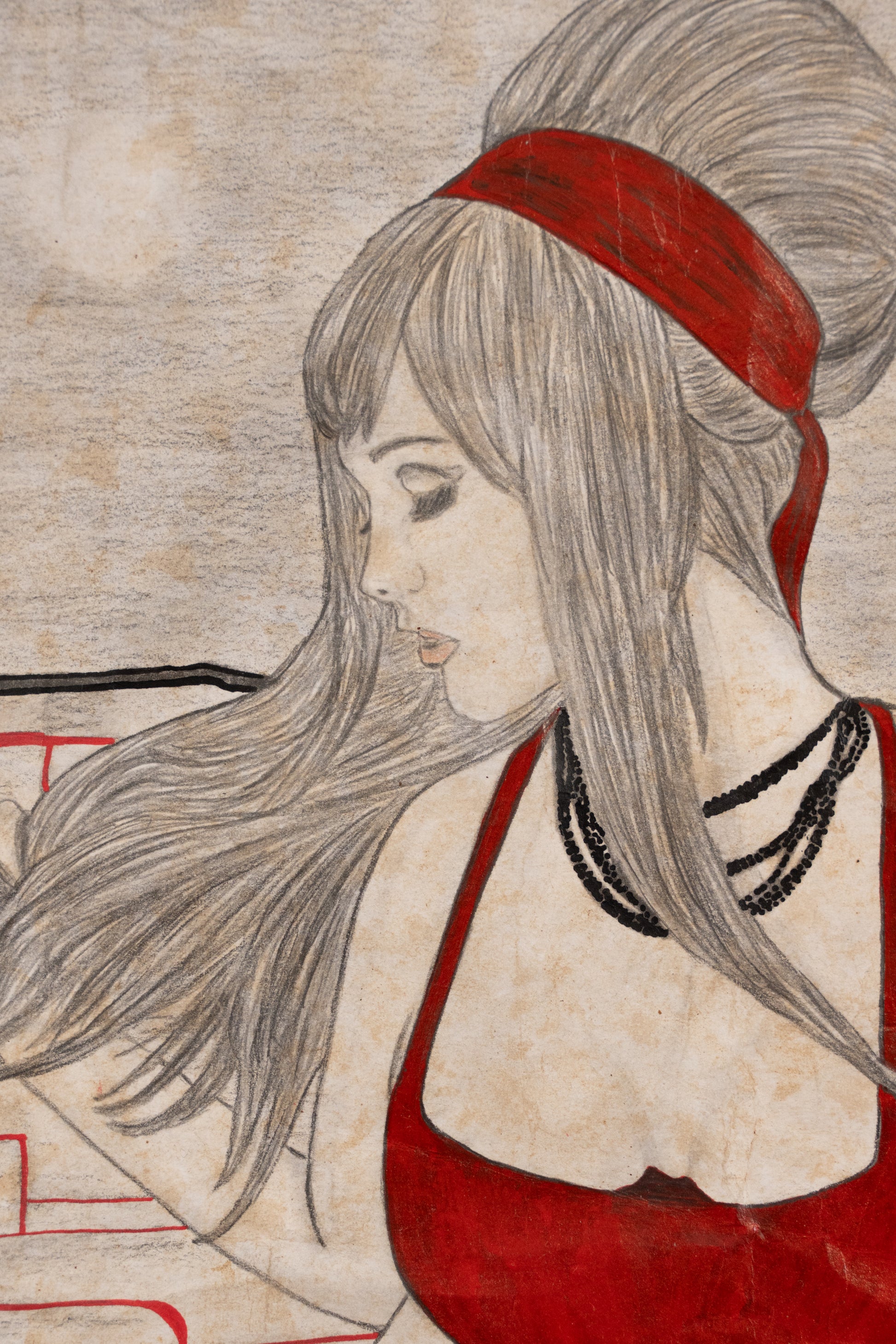 In a moment of serene reflection, this drawing depicts a woman in a red swimsuit with her head turned away, her hair flowing in a gentle breeze. The sketch-like quality adds a feeling of immediacy and intimacy to the image.