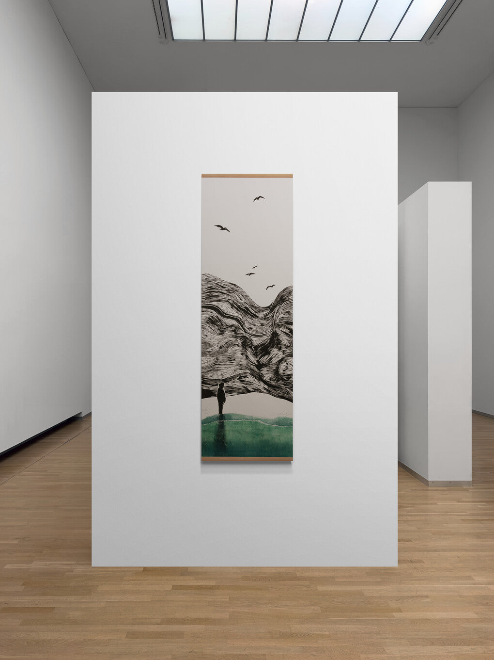 "Contemplative Horizon" presents a striking image of a solitary figure standing at the edge of a calm sea, gazing toward an imposing, wave-like mountain range. The birds soaring in the sky add a sense of freedom and movement, contrasting with the stillness of the figure and the sea. The artwork evokes a feeling of introspection and connection with nature.