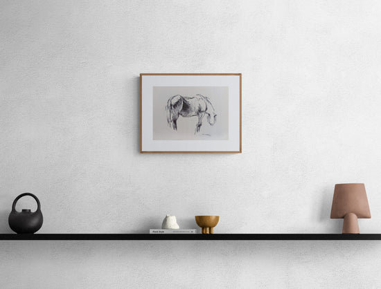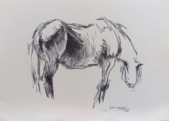 This artwork captures the elegant form of a horse using quick, dynamic strokes. Rendered in black ink, the gestural lines evoke a sense of movement and emotion, encapsulating the essence of the horse's posture in a minimalist, expressive manner. The sketch-like drawing leans towards contemporary art, emphasizing fluidity and spontaneity rather than detail, making it a captivating addition to any collection. The simplicity of the lines against the blank background highlights the animal's form, creating a powerful, contemplative image. Ideal for modern interiors, this piece speaks to lovers of expressive and abstract art. This limited edition (01/20) is signed by the artist.