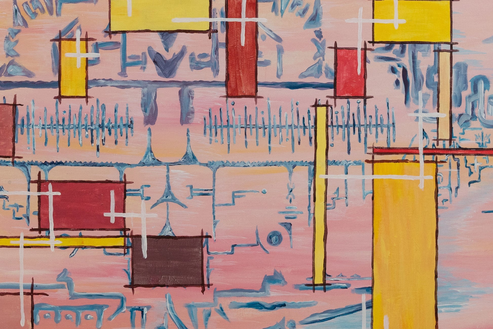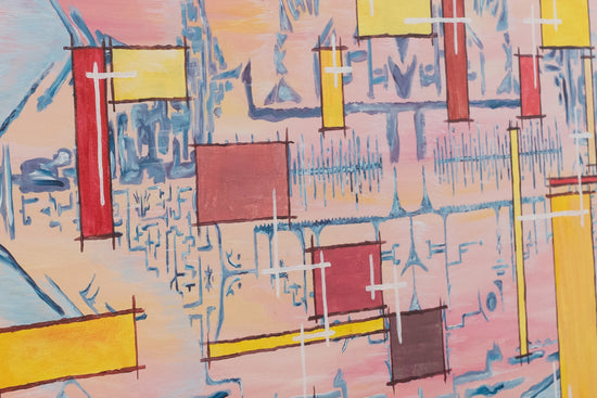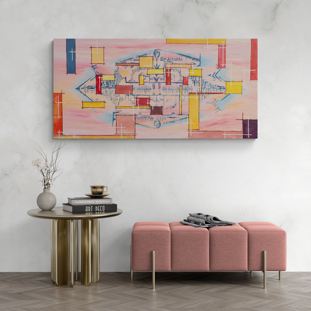 This wide-format painting by Samuel Xisto, presents an abstract landscape with a dreamlike quality, rendered in soft pastel colors.