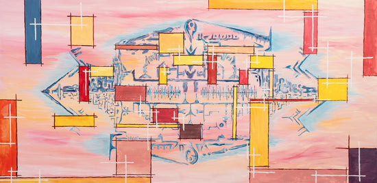 The canvas is filled with a series of cross shapes in various sizes and colors that appear to float against a wash of pink, blue, and orange hues, suggesting a sunset or sunrise.