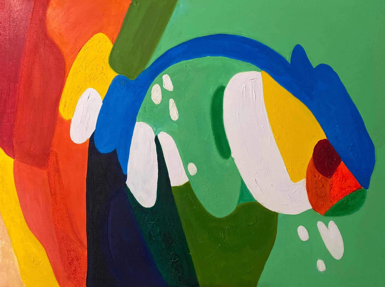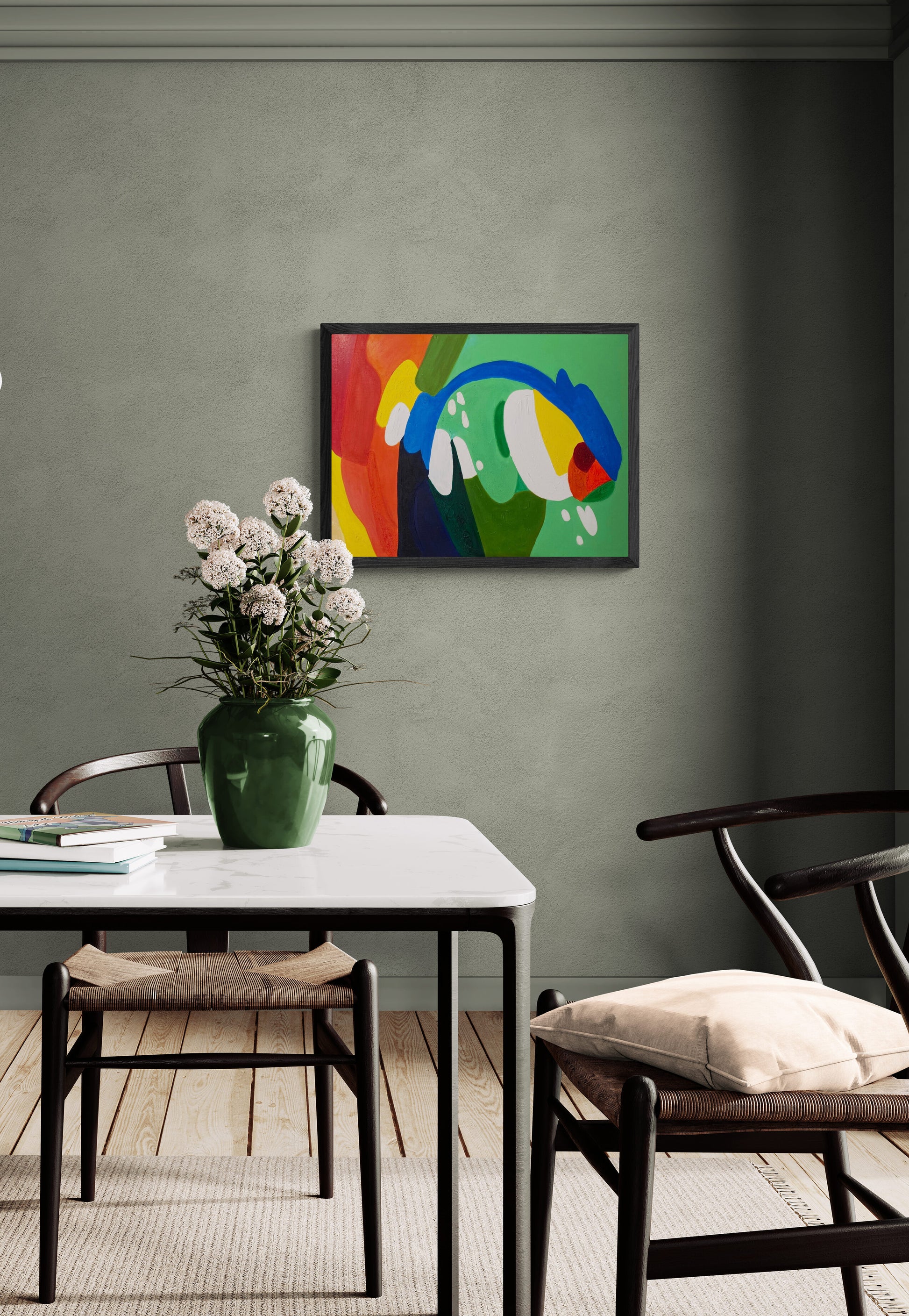 The dominant blue form curves across the canvas, creating a sense of fluidity, while the interplay of green and white shapes adds dynamic contrast. The organic shapes evoke a sense of movement and energy, while the textured layering of color invites the viewer into a world of abstraction. This composition explores form and space in a playful, free-flowing manner, allowing for personal interpretation and emotional resonance.
