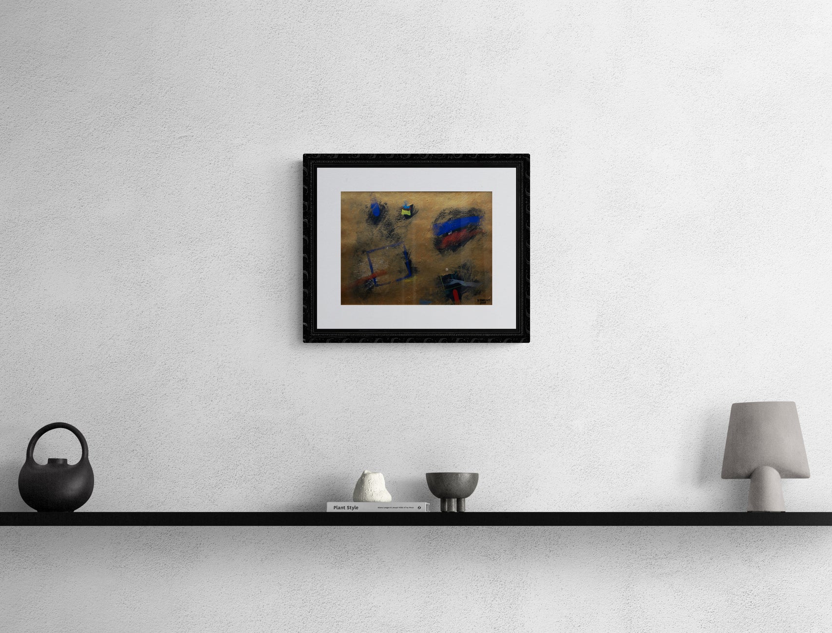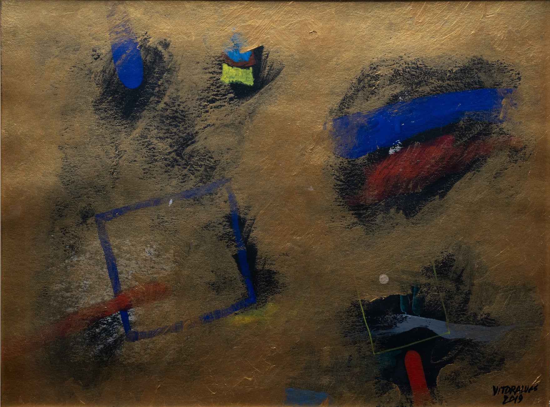 The painting offers an abstract landscape of texture and color, with bold strokes and shapes that give the impression of unearthed artifacts set against a cosmic backdrop.