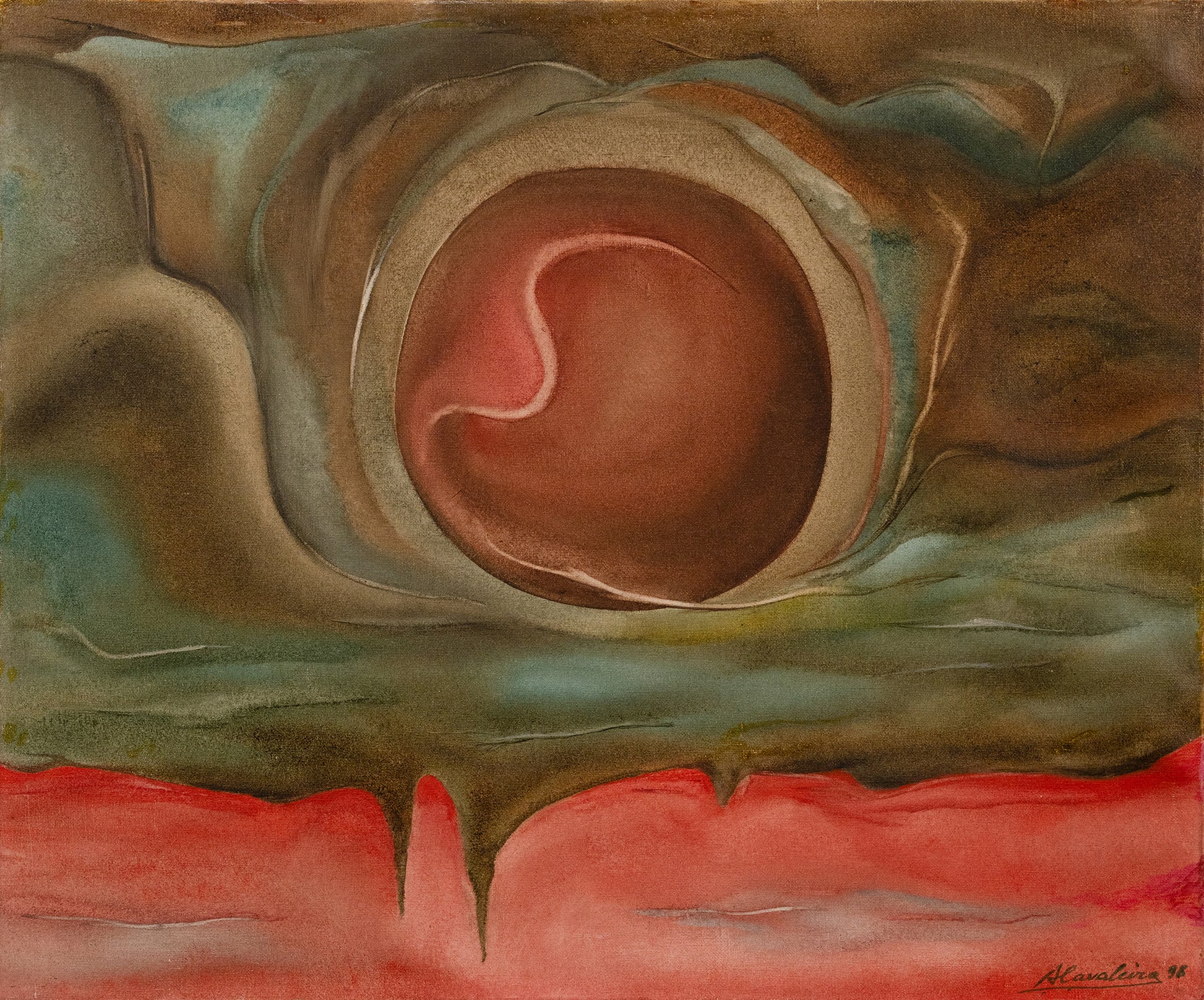 This abstract painting evokes a sense of creation and cosmic energy. The central swirling form, resembling a nascent celestial body or an embryonic shape, is enveloped by flowing, organic layers of earthy and celestial tones. The use of rich browns, greens, and reds, along with the fluid forms, suggests the dynamic interplay between the earthly and the ethereal, capturing a moment of profound transformation and genesis.