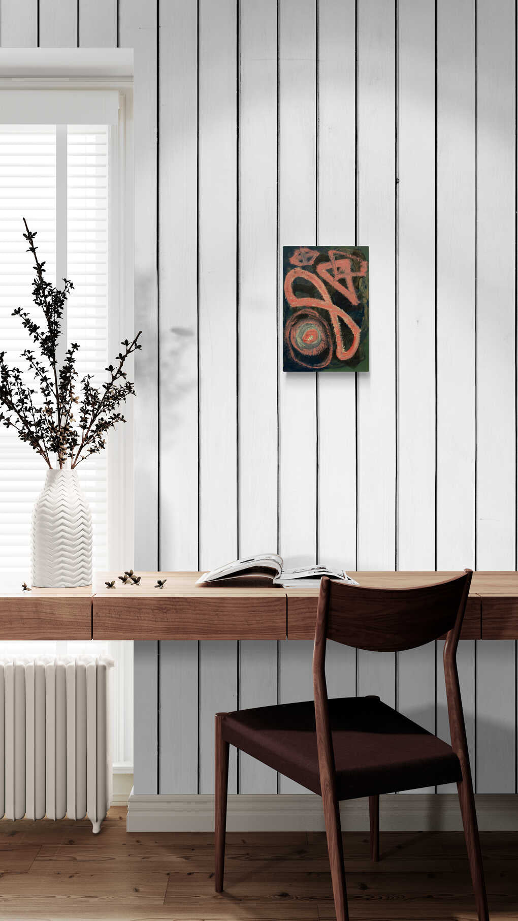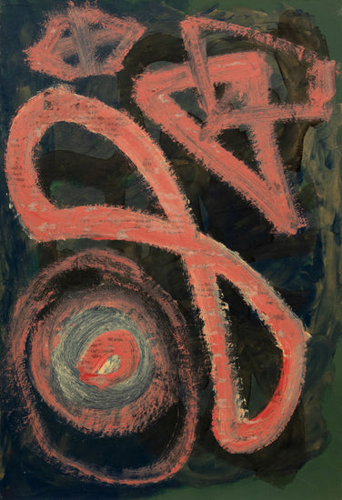 This abstract piece features swirling, interconnected shapes that evoke a sense of cosmic movement. The bold use of red and black creates a dynamic, energetic composition that draws the viewer into a dance of forms and colors.
