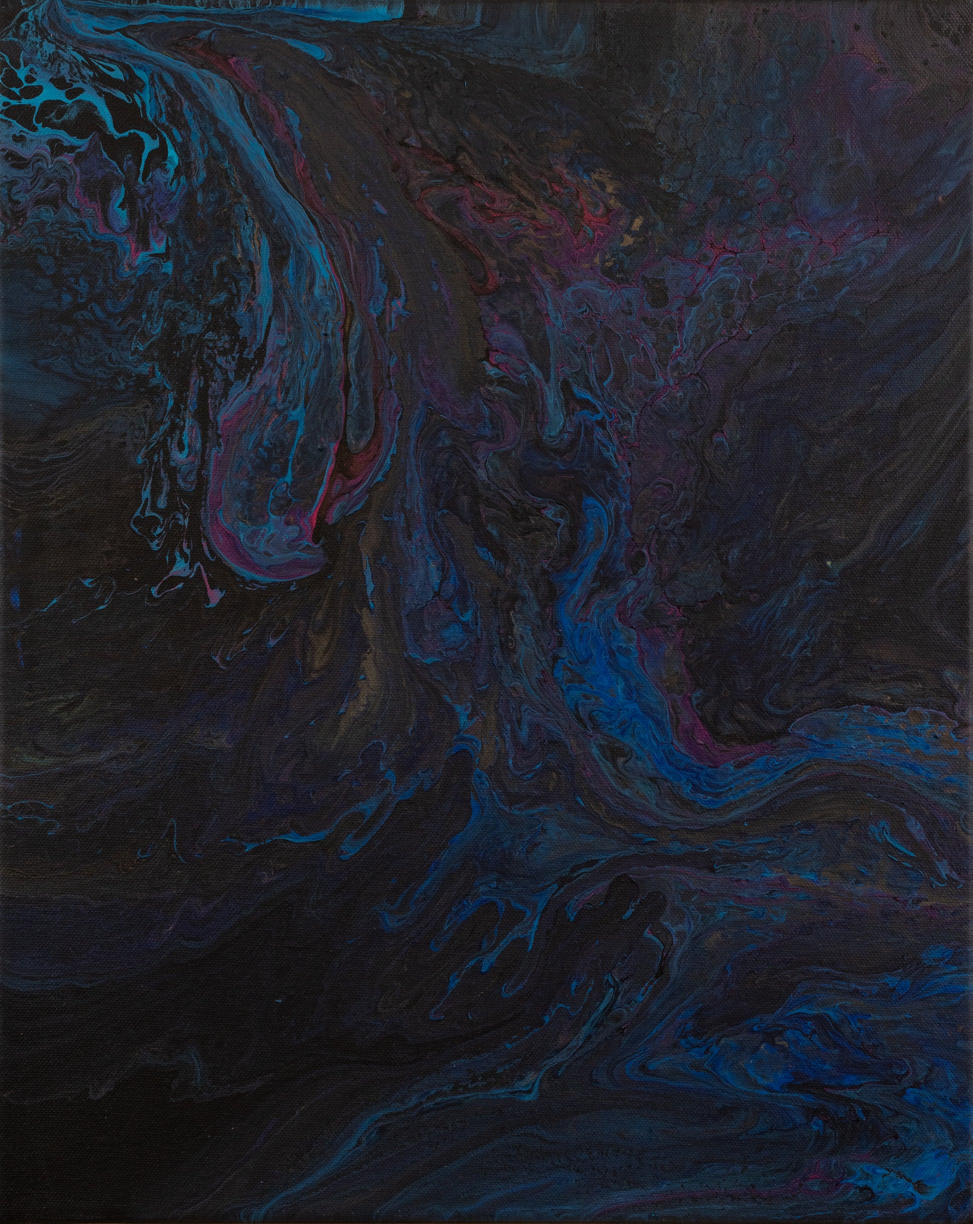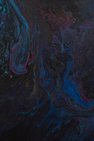 This painting captures the chaotic beauty of a cosmic event, with swirling patterns of blues, pinks, and purples that appear to move fluidly across the canvas. The use of dark backgrounds enhances the vivid colors, creating a deep, immersive visual experience.