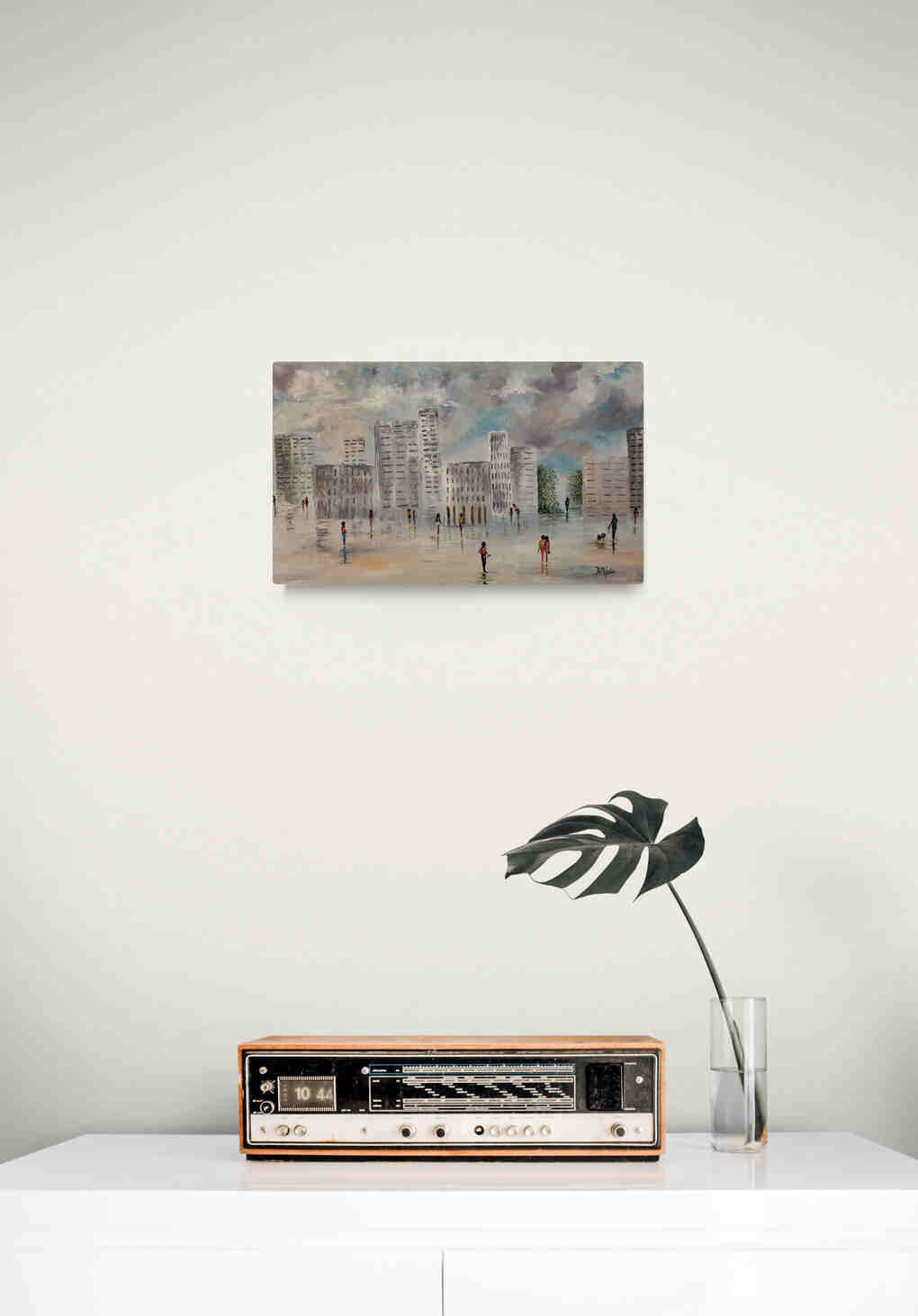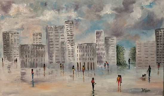 This panoramic painting captures a busy city street on a clear day. The city is rendered in soft hues, with the sky painted in vibrant blue and white, suggesting a bustling yet calm urban scene. The painter uses a technique that blends elements of impressionism with realism, utilizing fluid brush strokes to create reflection and depth on the surface, suggesting the movement of people and light across the cityscape.