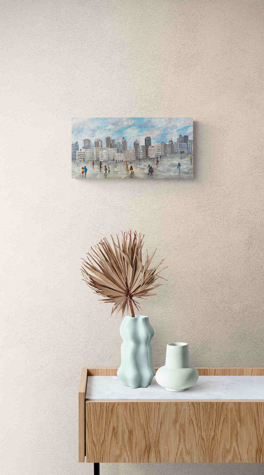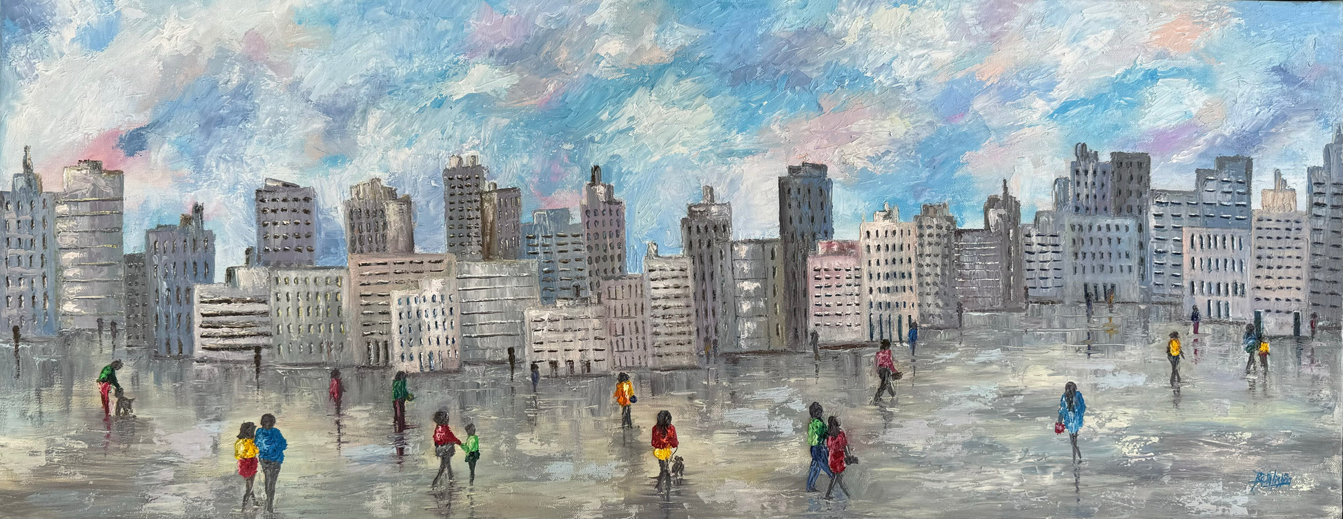 This expansive painting showcases a bustling cityscape under a dynamic sky, where figures traverse the reflective surfaces left by recent rainfall. The urban environment is depicted in a range of muted grays and blues, contrasted vividly with the colorful attire of the city dwellers, infusing life into the concrete jungle. The artist employs a mixed-media technique, combining elements of impressionism to capture the fleeting clouds and reflective puddles with realism that details the architectural features of the buildings. The varied brushstrokes enhance the painting’s texture, emphasizing the chaotic yet rhythmic pulse of city life. This work invites viewers to reflect on the interplay between urban environments and their inhabitants, suggesting a narrative of resilience and everyday motion amidst metropolitan structures.