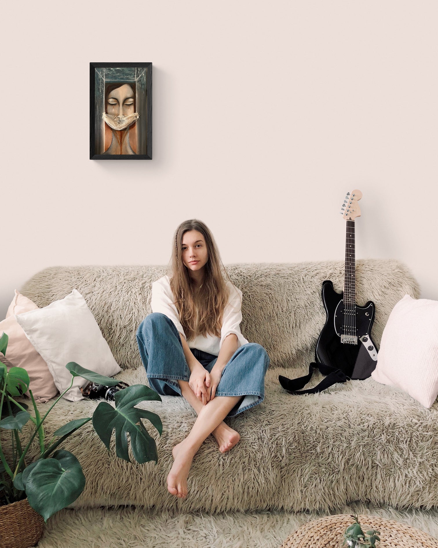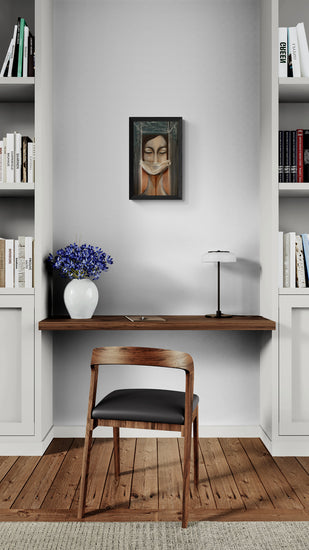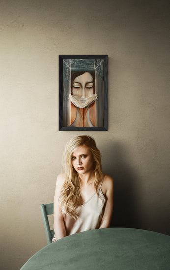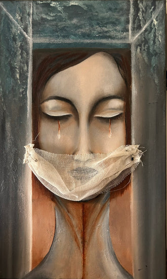 This powerful artwork portrays a woman with her eyes closed, streams of tears falling as symbols of sorrow and grief. Her face is partially covered by a delicate, gauze-like mask, pinned on either side.