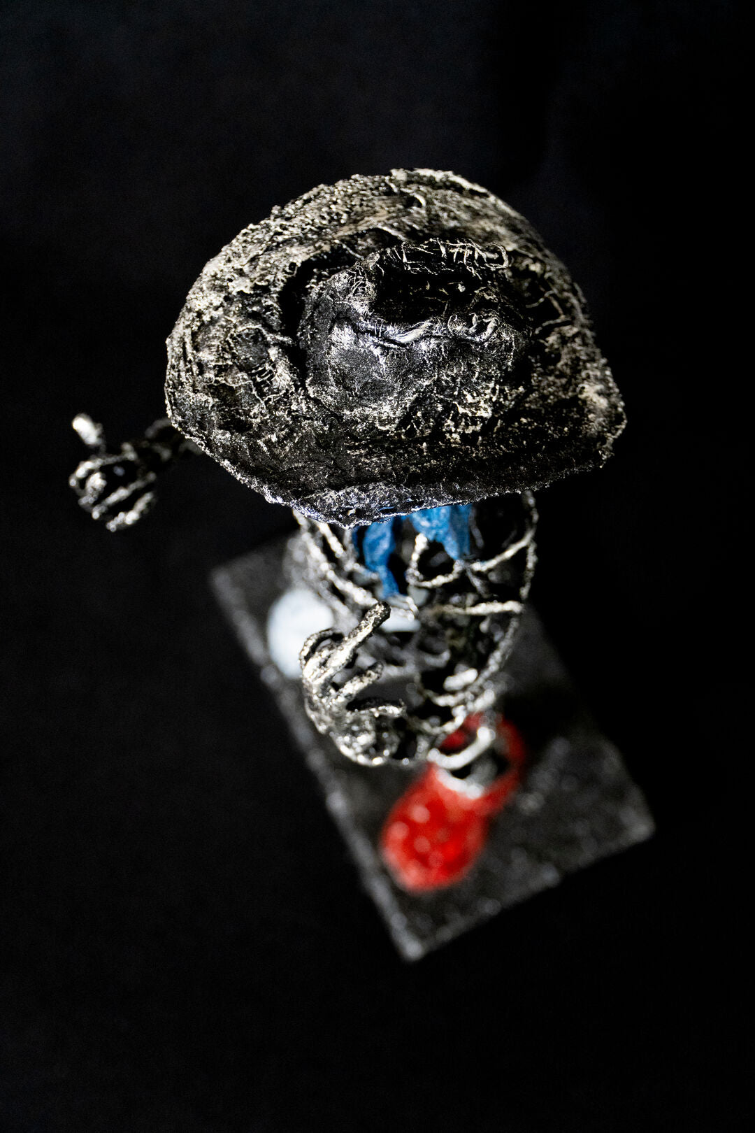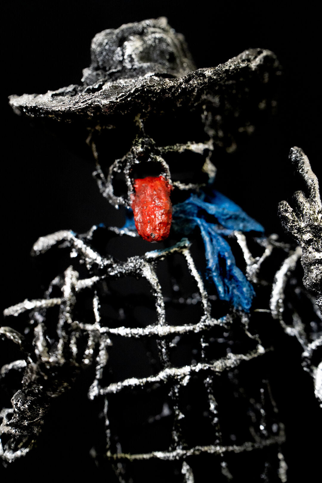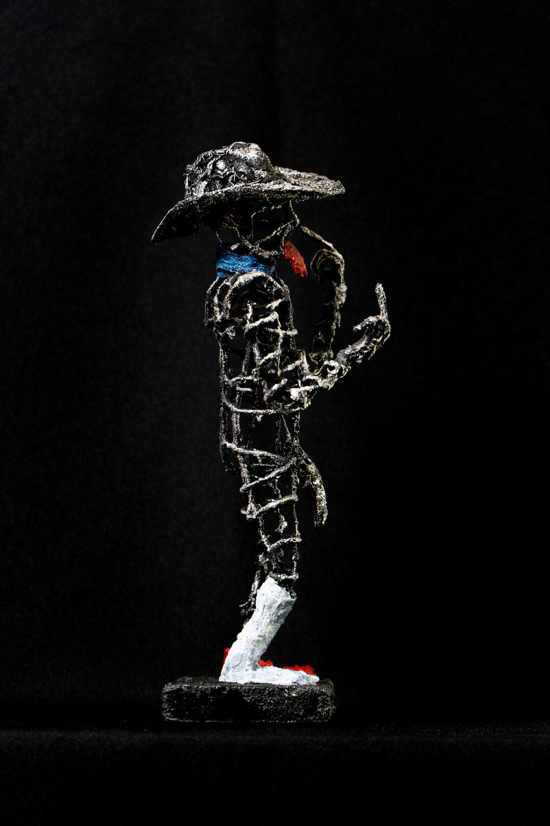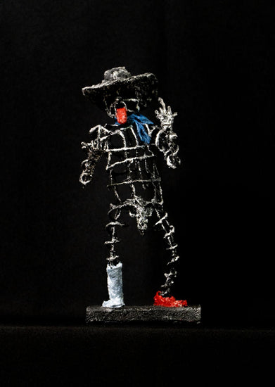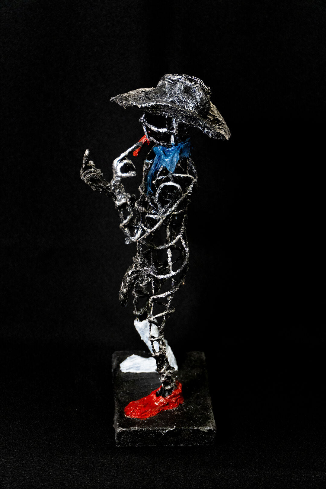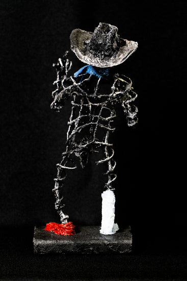 A striking wire sculpture that captures the essence of a solitary figure with a rugged charm. Fashioned from twisted metal and painted with a minimalist palette, the cowboy’s skeletal structure exudes a sense of resilience and character. With one boot painted red and the other blue, the figure's stance reflects individuality and a touch of whimsy. A blue scarf around his neck and a red band on his face suggest subtle details of personality and style, while the wide-brimmed hat completes his classic cowboy look. This piece balances raw, industrial materials with expressive artistry, creating a unique figure that feels both timeless and contemporary.