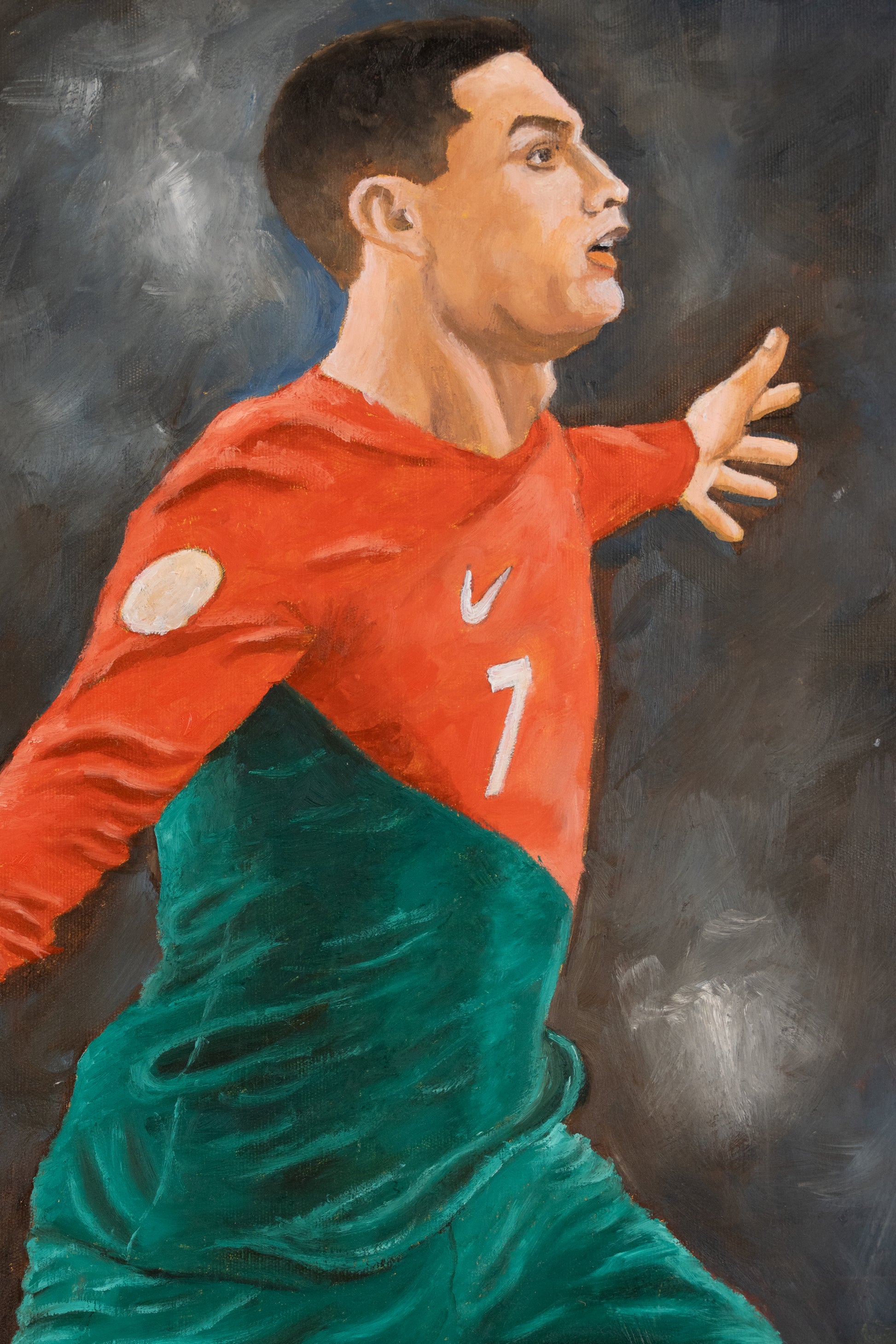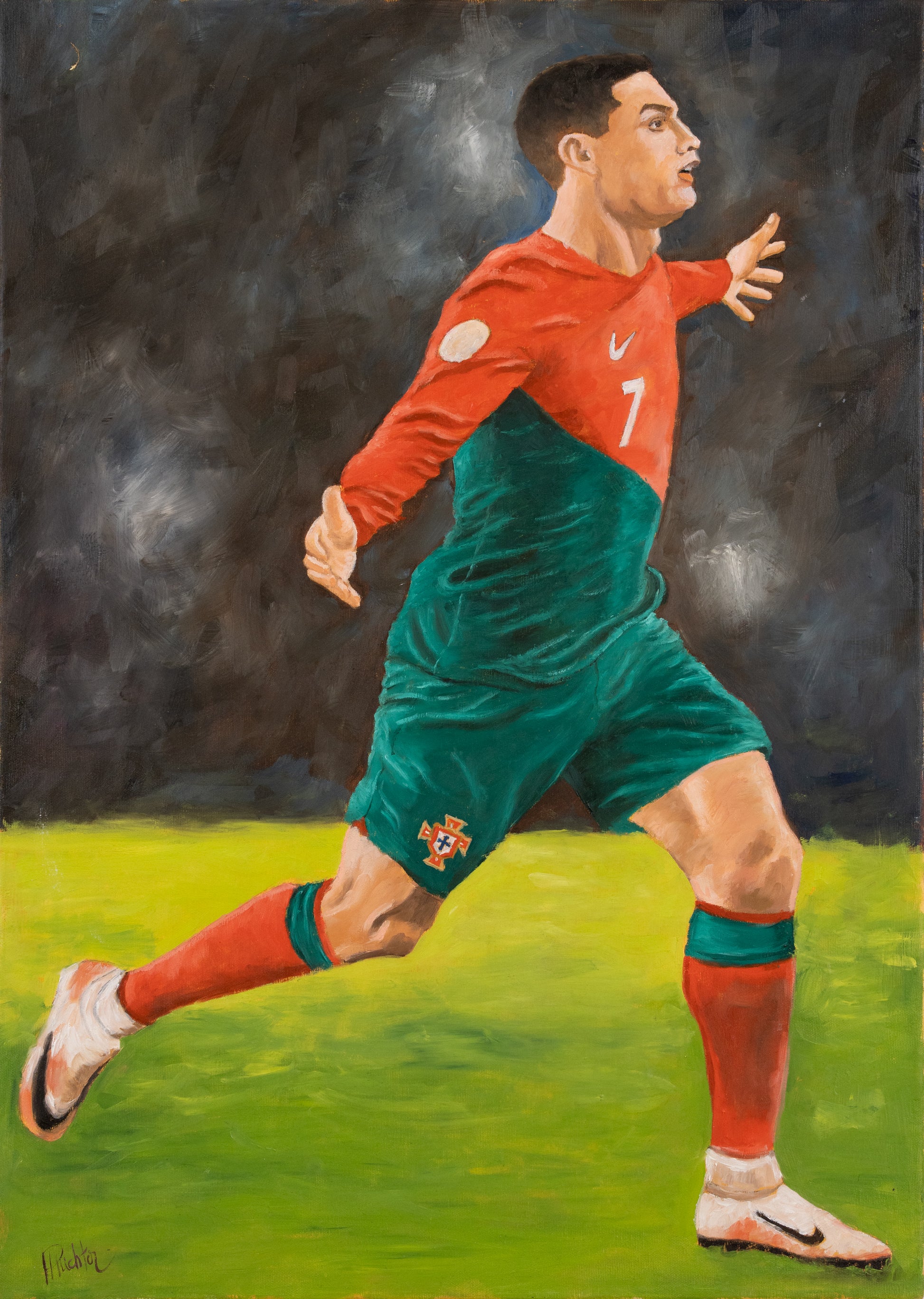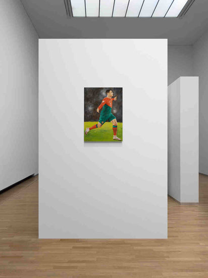 This vibrant painting captures a soccer player in mid-stride, vividly portrayed in the national colors of Portugal. His focused expression and dynamic pose convey the intensity and passion of the game, set against a dark, abstract background that highlights his figure.