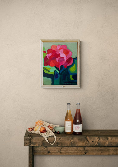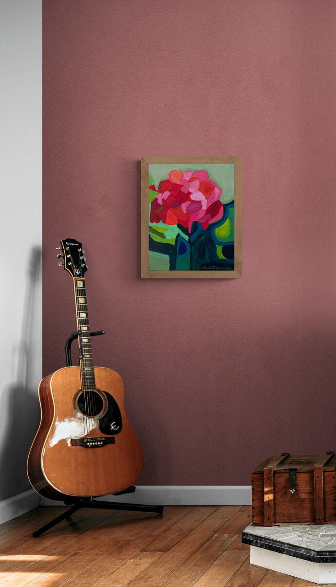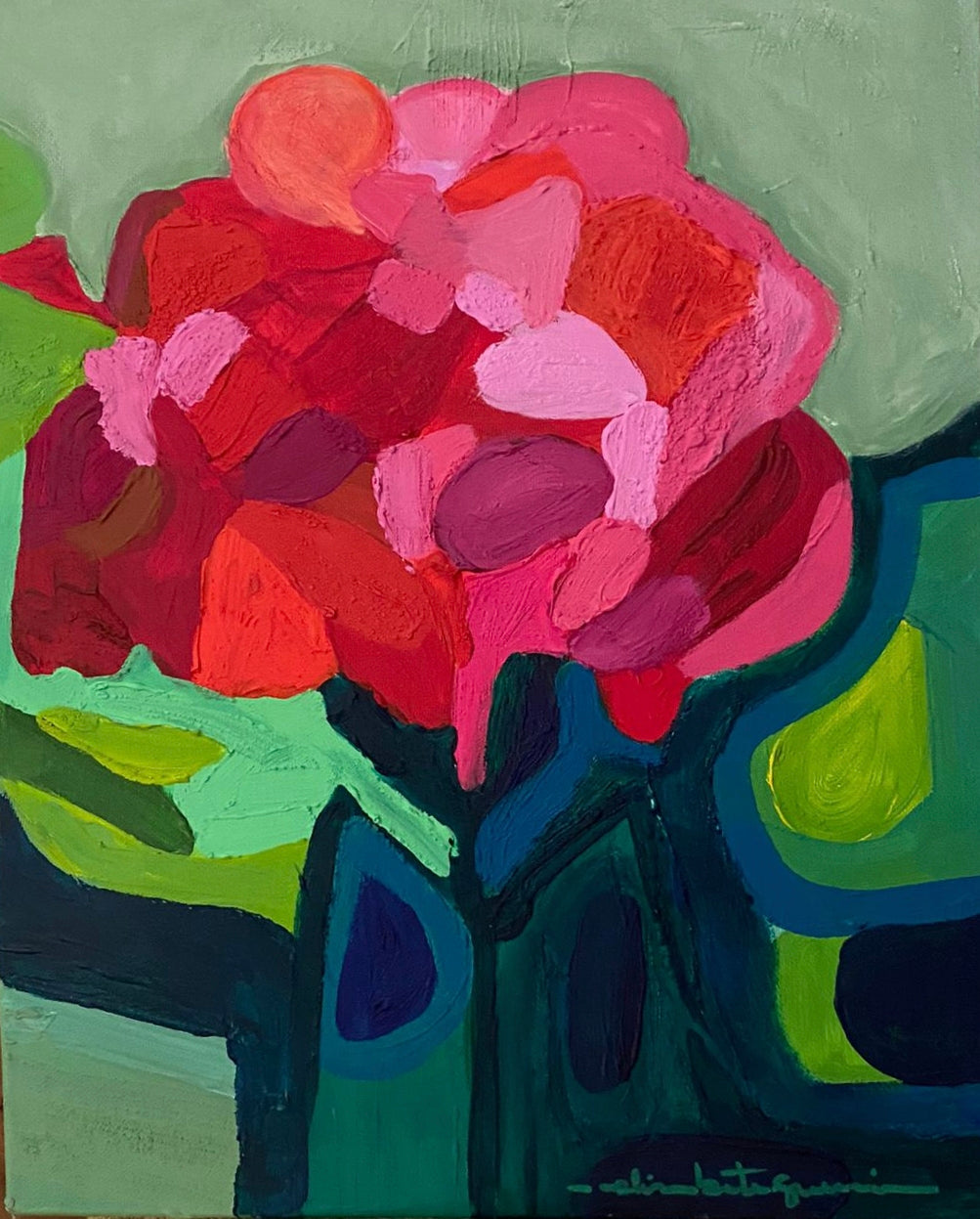 The organic shapes in the petals are juxtaposed with more defined, geometric elements in the stems and background, offering a blend of nature and structure. The green and blue hues in the surrounding areas provide a calm, contrasting backdrop to the bold flower, enhancing its central prominence. This piece conveys a sense of blooming energy, capturing the essence of a flower in abstract form, offering both visual intrigue and emotional warmth.