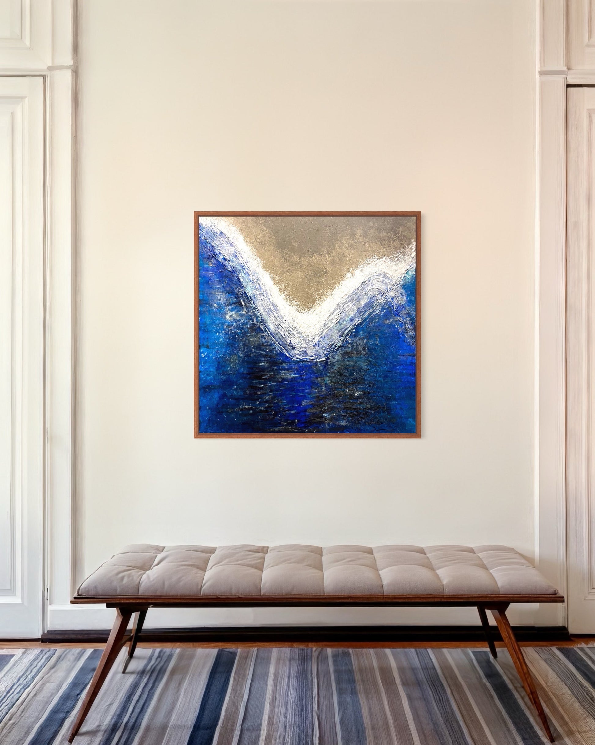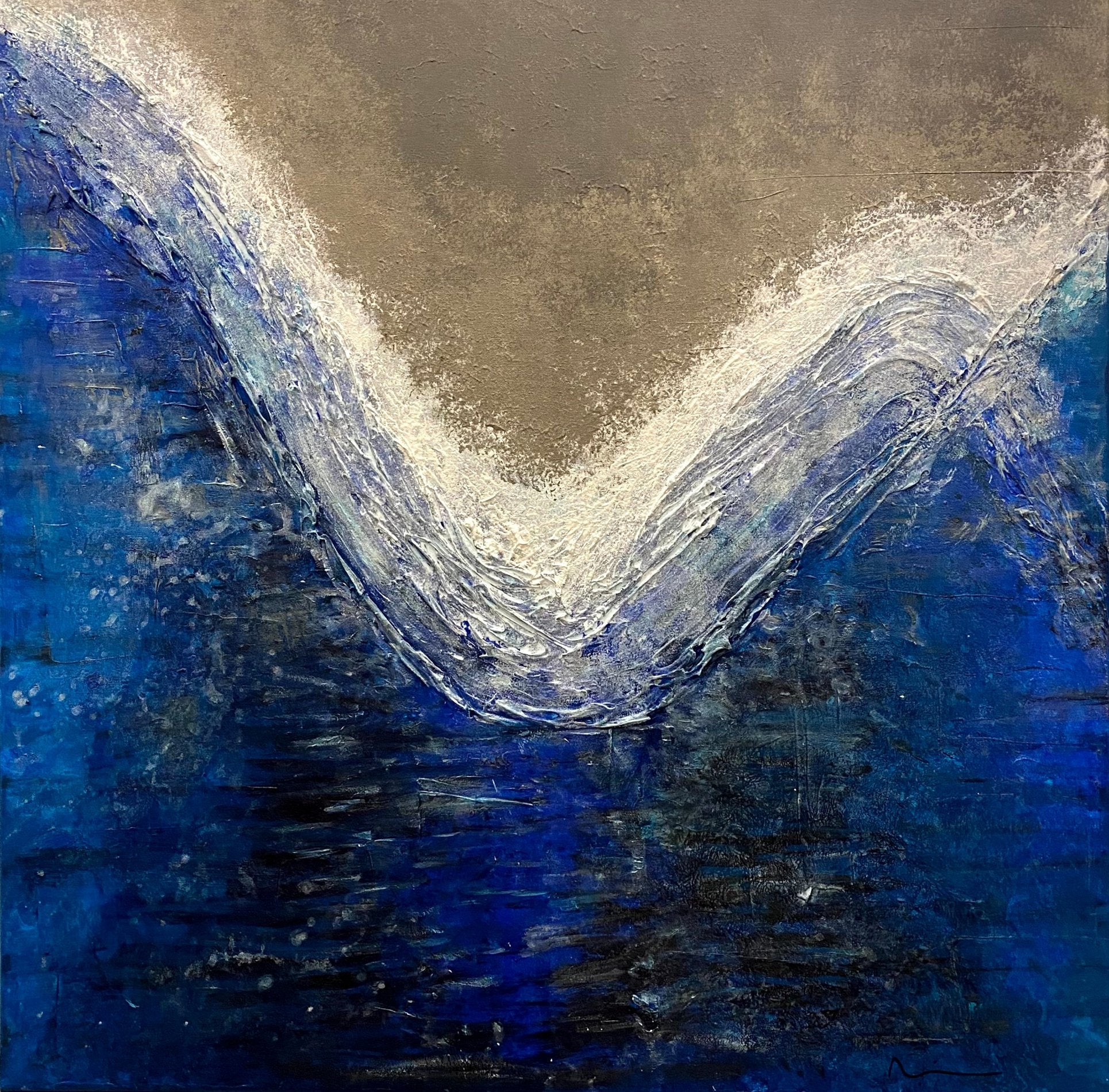 Powerful yet serene moment of a wave about to break, with deep blues blending into soft whites, evoking the dynamic energy and fluidity of the ocean. The texture of the piece emphasizes the movement and turbulence of water, creating a tactile experience as the viewer’s eyes follow the sweeping curve of the wave. The contrast between the dark blues and light crest conveys both the weight and grace of the sea, inviting a sense of calm amidst strength.