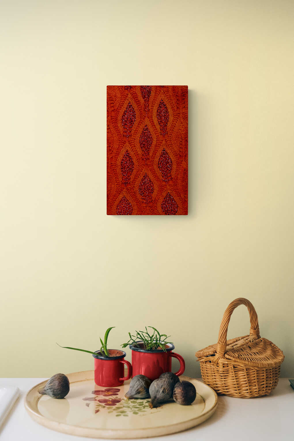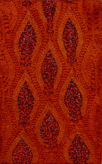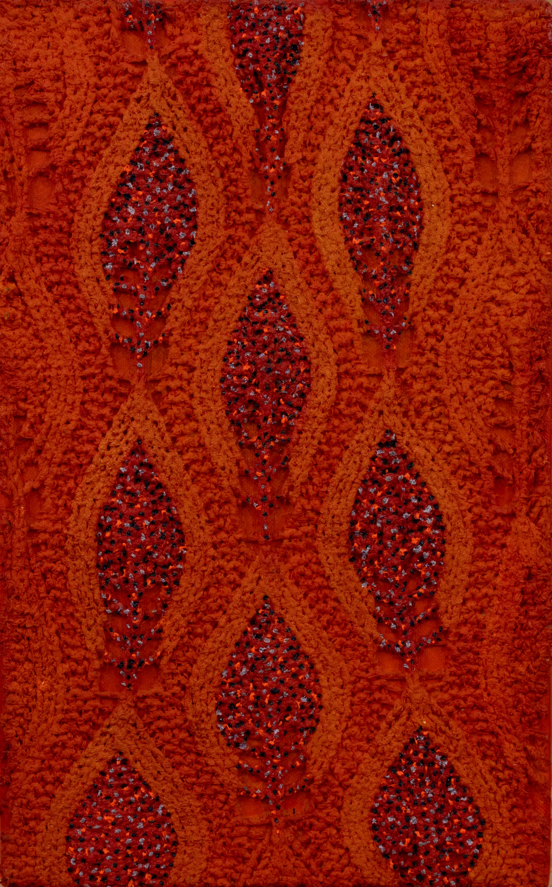 An abstract piece featuring intricate patterns in various shades of red. The textured surface and repetitive motifs create a sense of depth and rhythm, inviting viewers to explore its details.