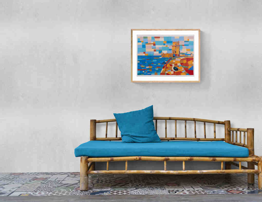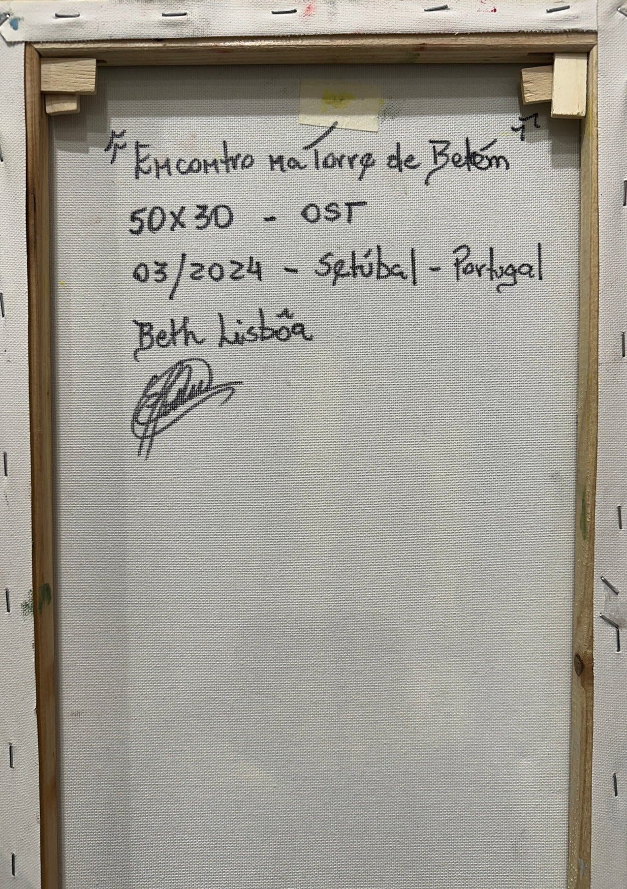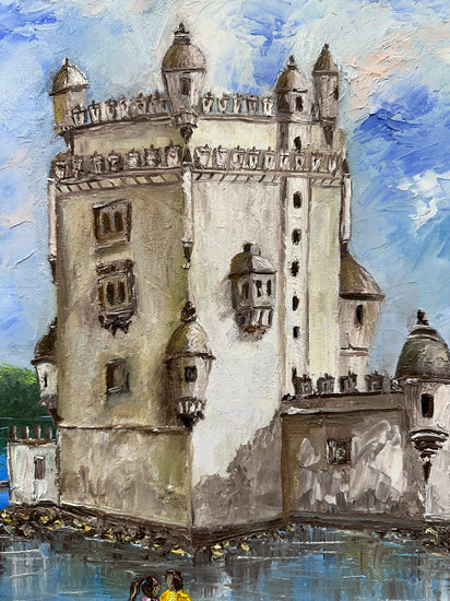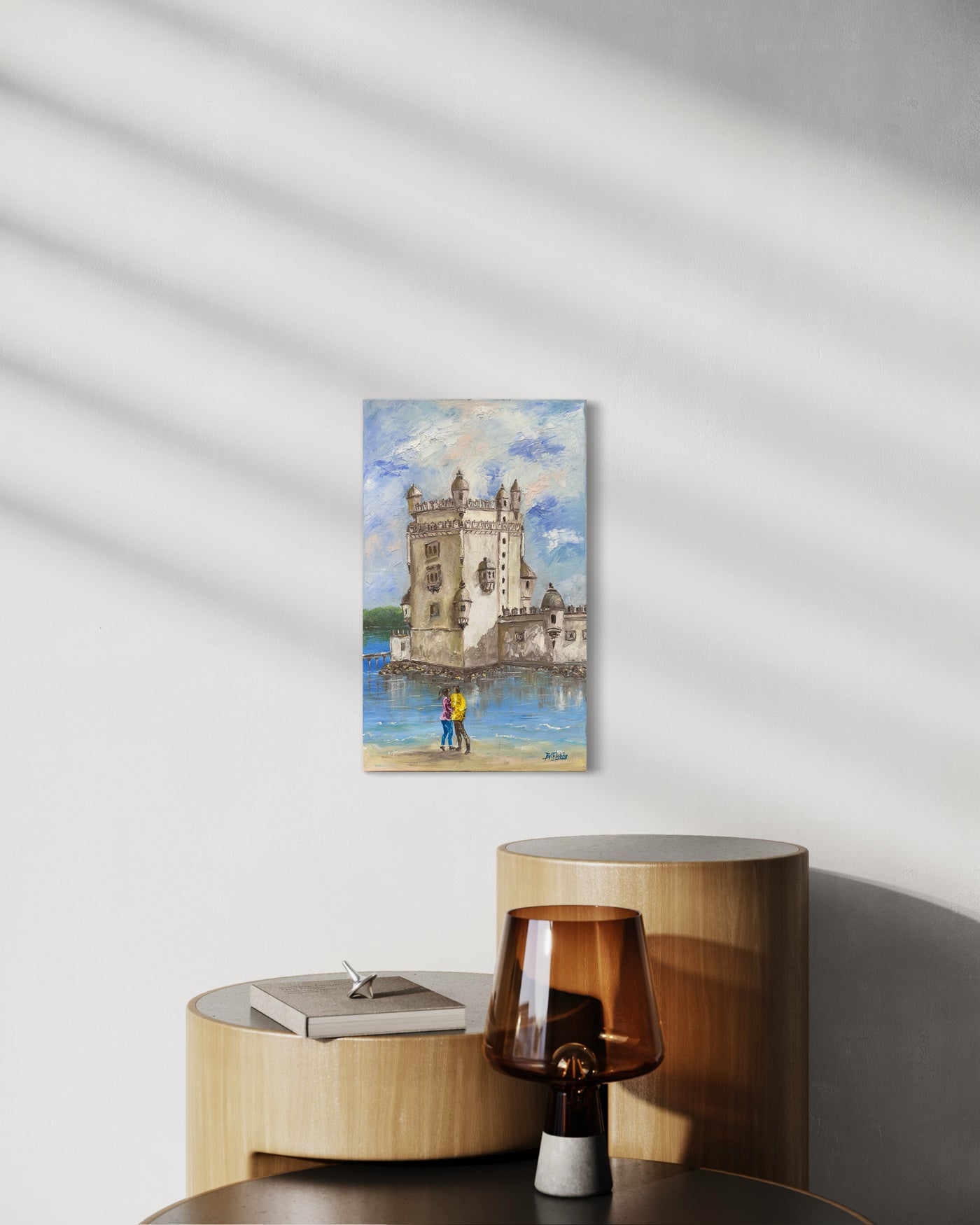 The image depicts a couple sharing a moment on the shores across from the Torre de Belém. Their colorful attire stands out against the muted tones of the historic tower and the serene blue of the water, reflecting both the sky and the structure.