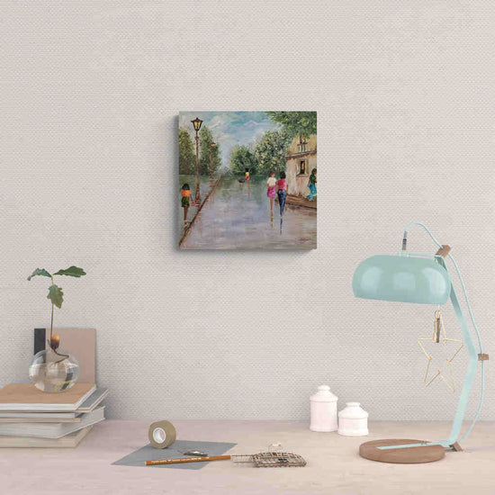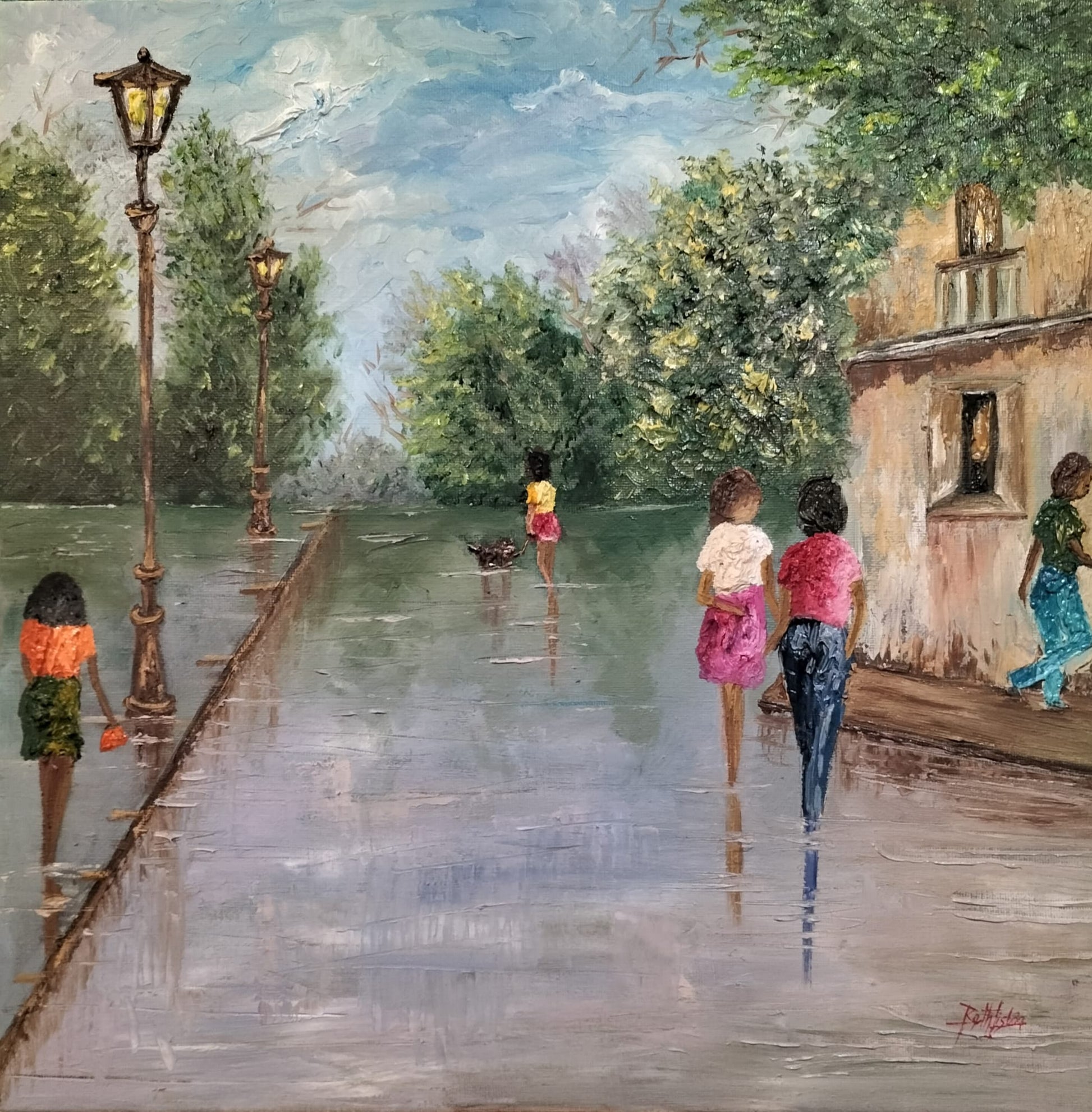 This painting captures a serene moment following a rainstorm, where individuals walk along a lamp-lit pathway that mirrors the sky above. The reflection on the wet surface creates a visual link between the tranquil blue of the sky and the earth, suggesting a moment of clarity and freshness in the air. The impressionistic style allows the artist to play with light and shadow, emphasizing the soft glow of the street lamps and the natural lushness of the surrounding greenery. The figures, painted with vibrant colors, add a lively contrast to the otherwise soft palette, bringing warmth and movement into the scene. This artwork beautifully conveys the peaceful yet invigorating experience of a post-rain walk, highlighting nature’s ability to cleanse and rejuvenate the urban landscape.