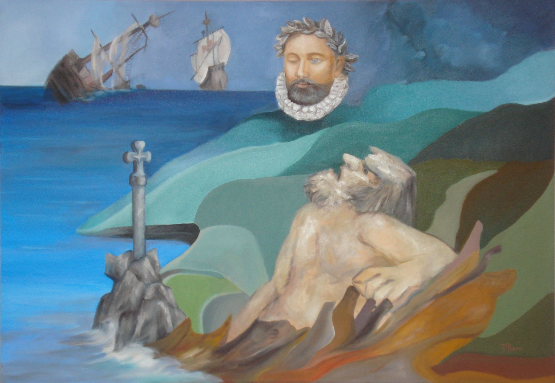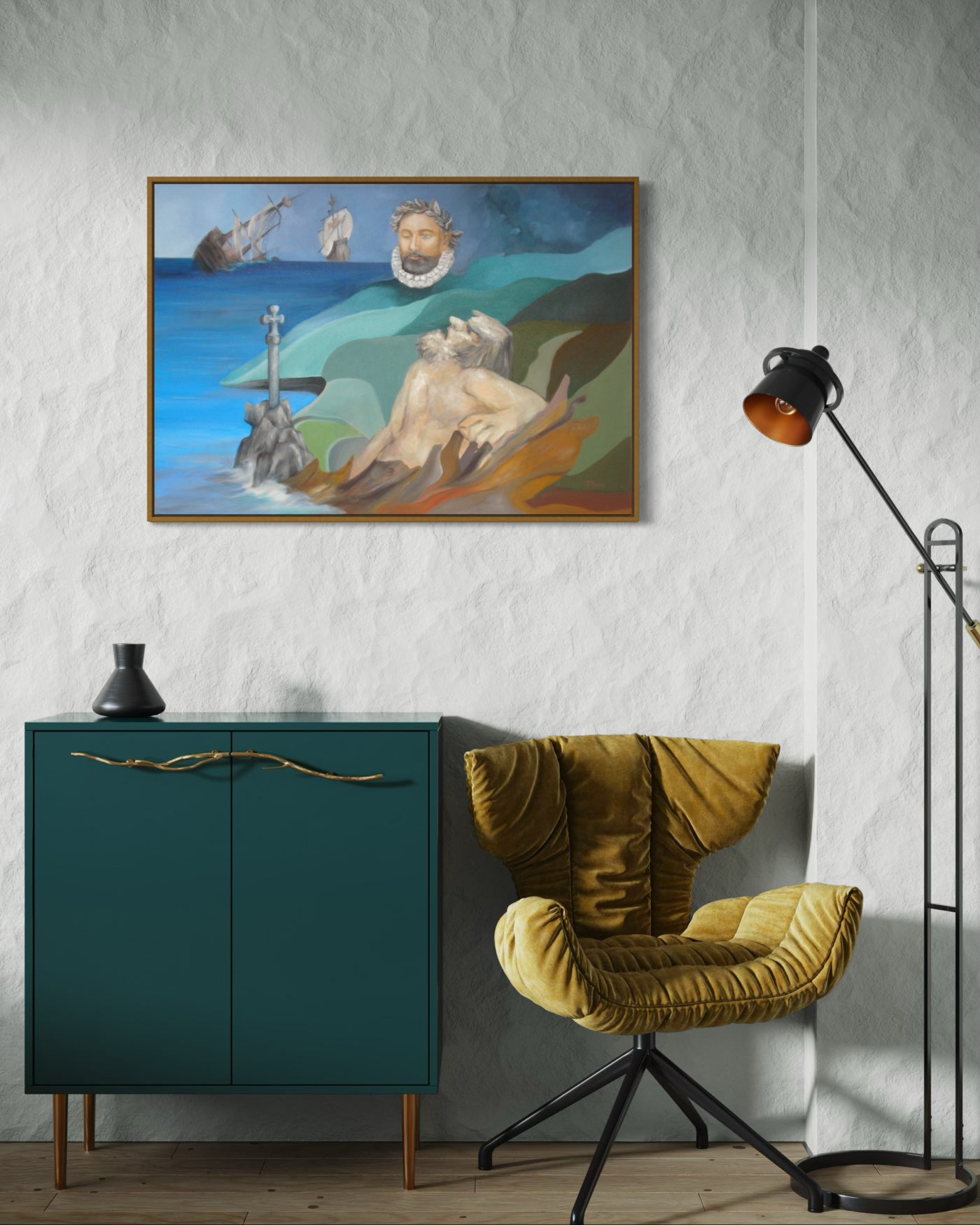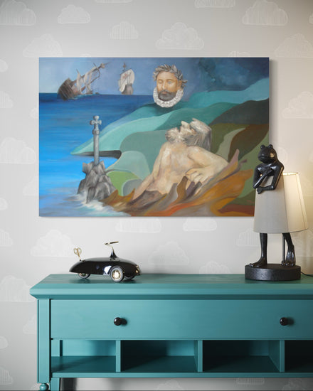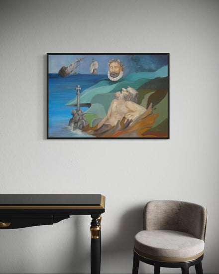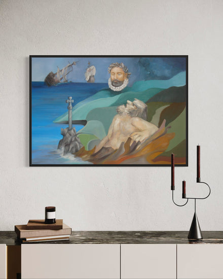 In Destino, the past surfaces like a vision from the deep. A shipwreck fades into the oceanic distance, while a bearded figure lies cast ashore, both anchored and adrift in time. Above him, the spectral face of Luís de Camões gazes forward — poet, navigator, and symbol of Portugal’s epic soul. With surreal contours and symbolic layering, the composition evokes fate, heritage, and the enduring power of myth.