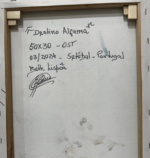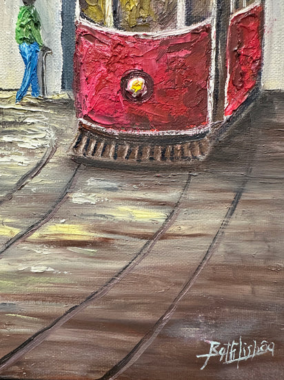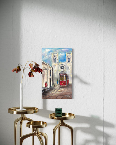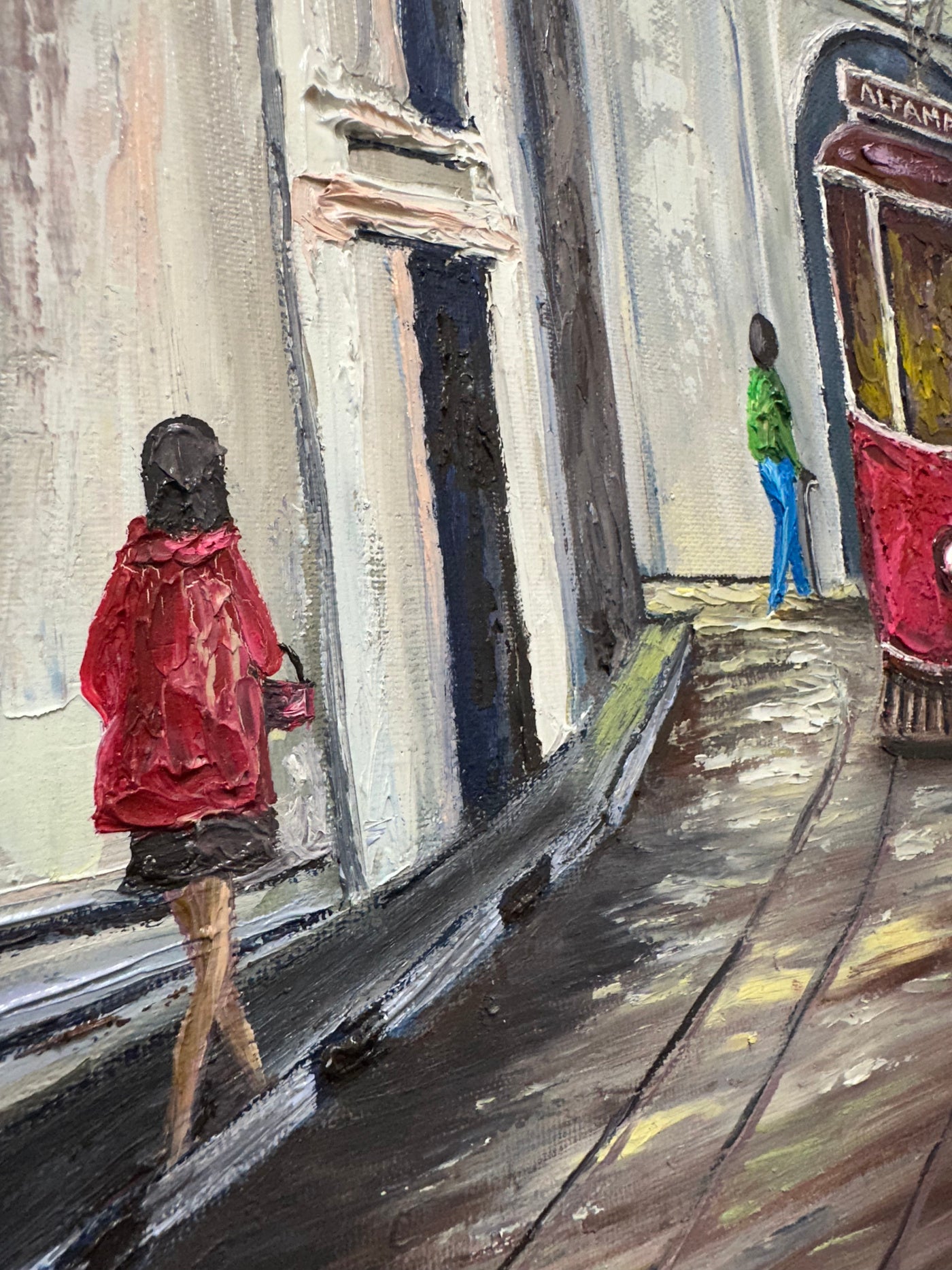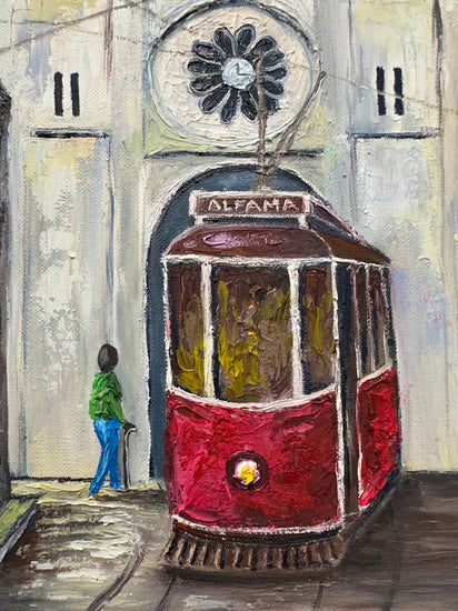 The painting captures a quaint street scene in Alfama, with the iconic red tram adding a vibrant splash of color. Pedestrians in the foreground provide a human scale against the historical architecture, under a softly rendered sky.