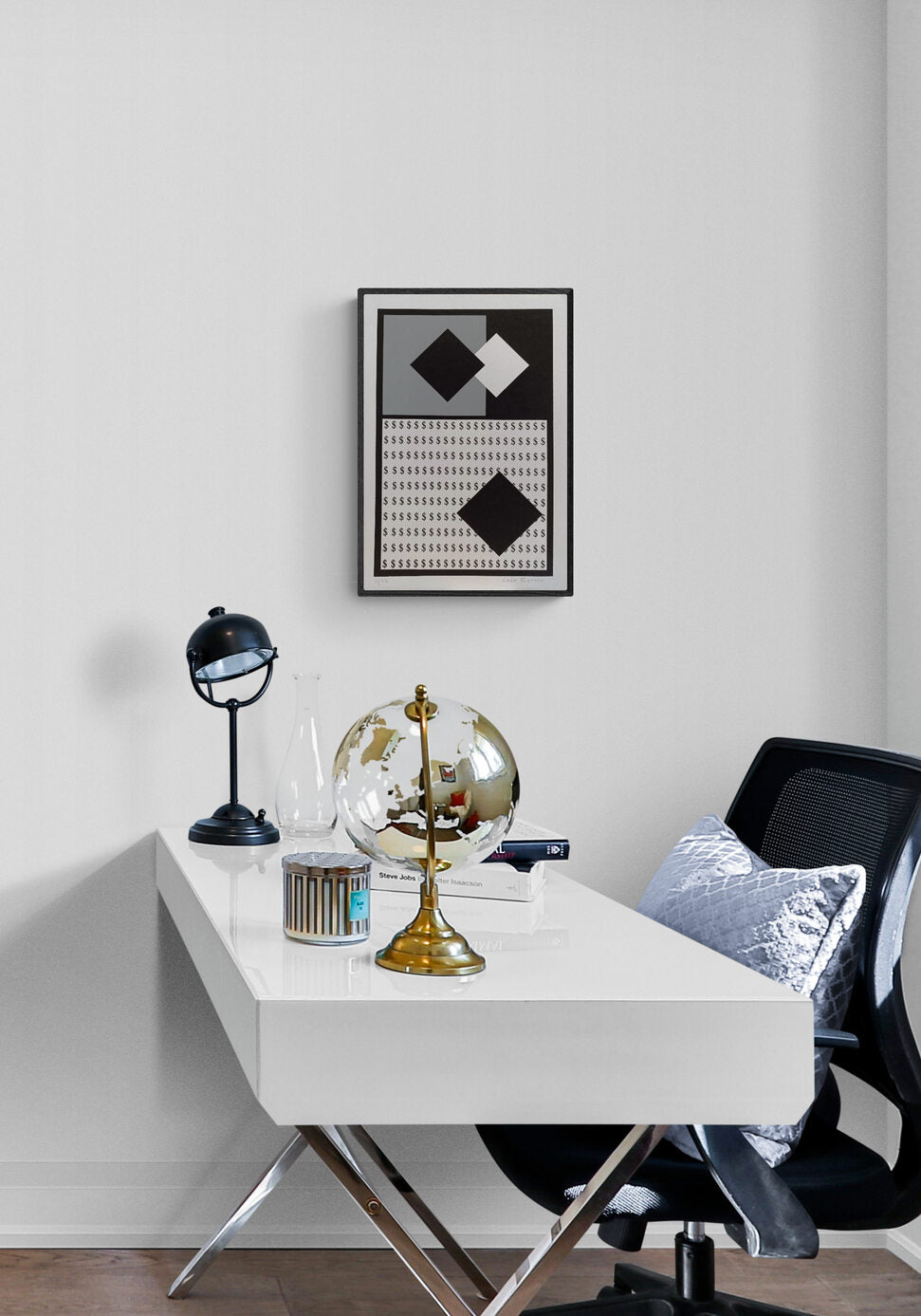 In this piece, Carlos Furtado employs minimalist geometry paired with repetitive symbols of the dollar sign, creating a visual representation of the pervasive influence of commerce and monetary value in modern society. The juxtaposition of black and white diamonds with the repeated dollar symbols highlights the contrasts between wealth, value, and the systems of exchange. The sharp shapes and precision in design add a mathematical and economic dimension to the artwork, encouraging contemplation of materialism and the digital age.