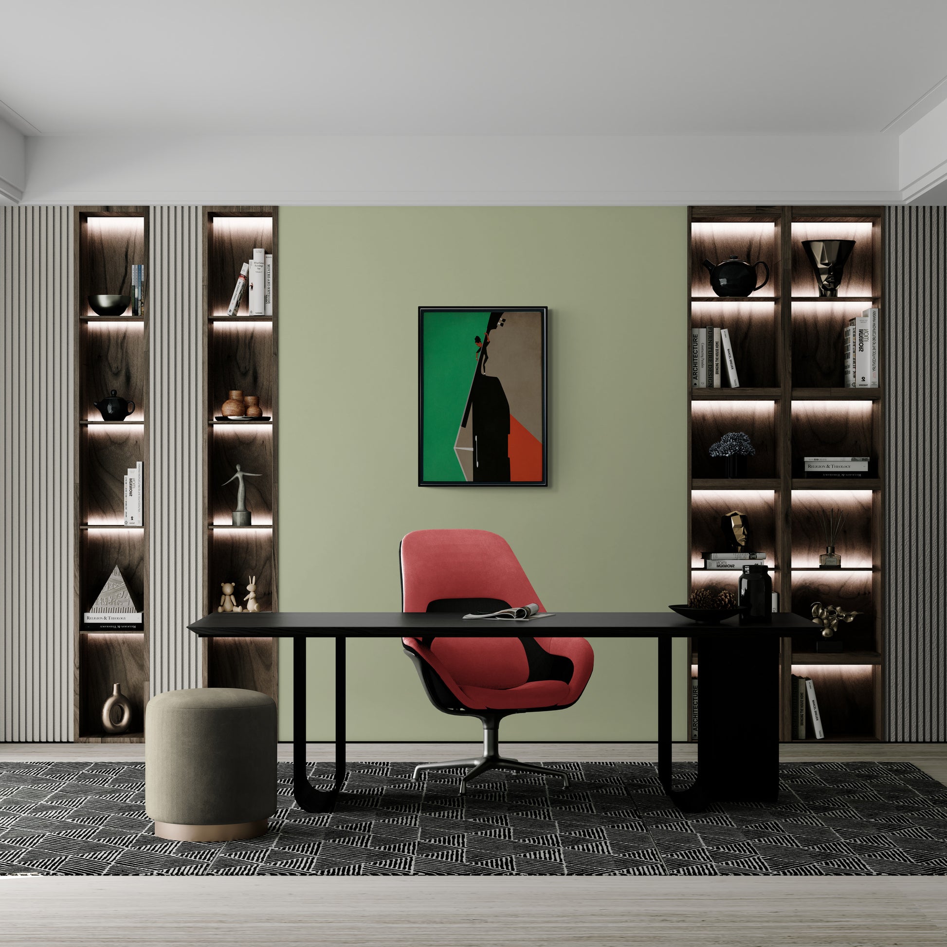A modern, minimalist illustration of a musician playing a towering double bass, their figure leaning gracefully into the instrument's massive form. The background features bold geometric blocks of green, gray, and red, adding vibrancy and contrast to the black double bass.