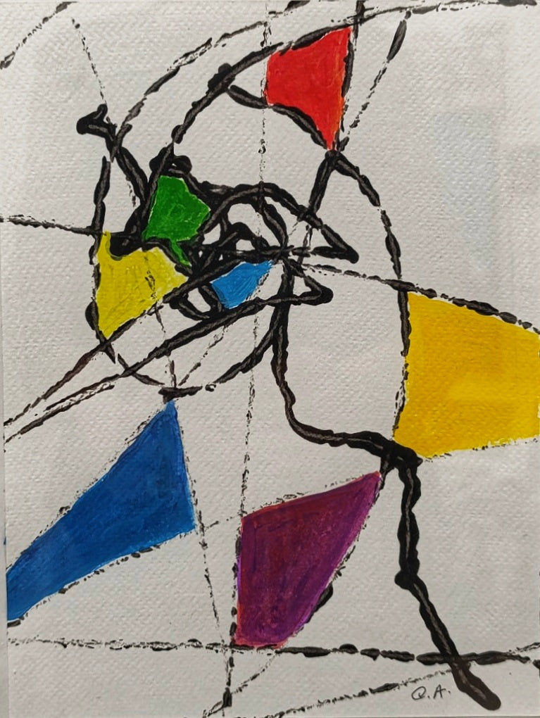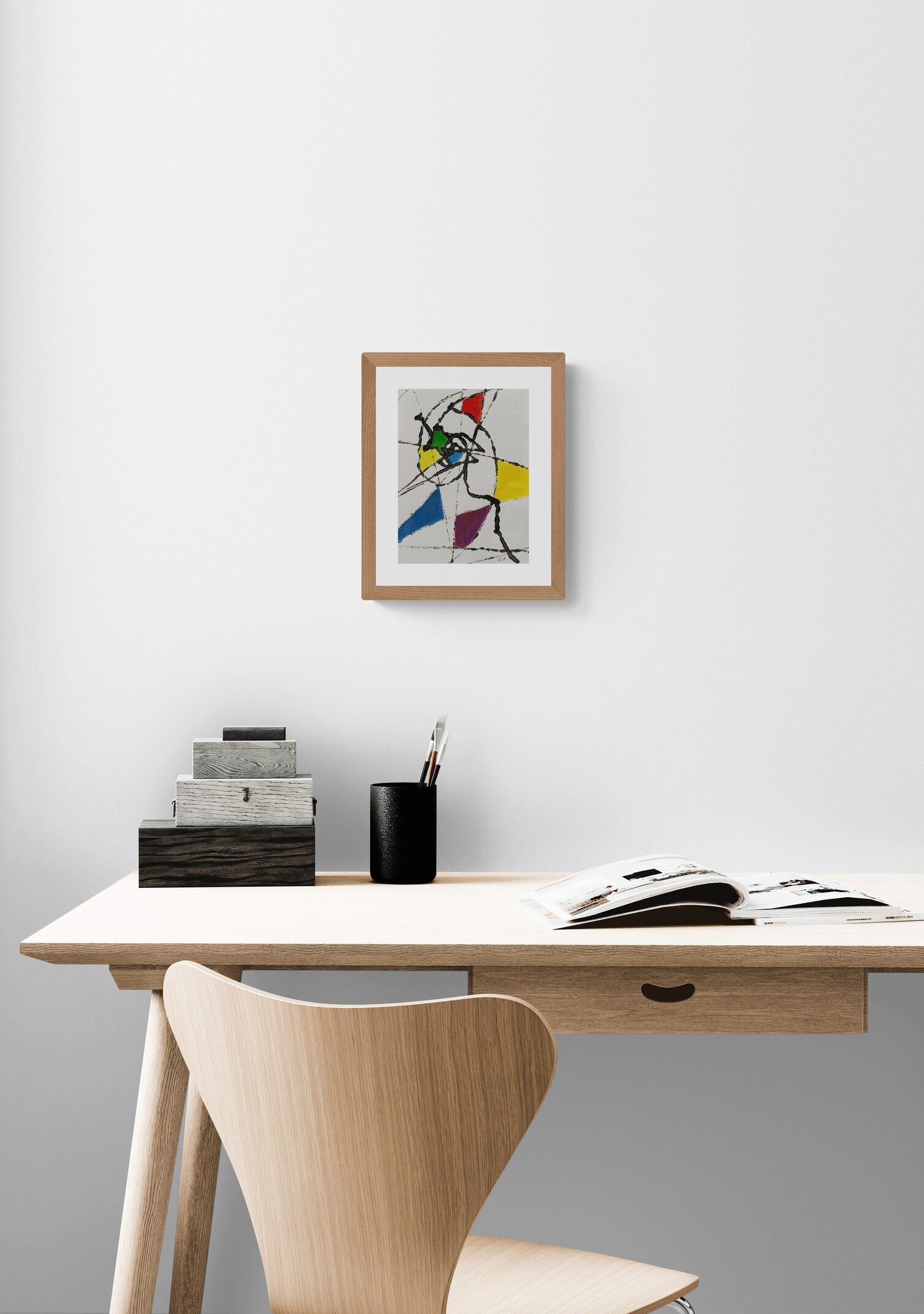 The vibrant red, green, yellow, blue, and purple forms stand in stark contrast to the textured white background, offering a visual narrative of balance amidst chaos. Each shape appears to be in motion, converging toward the center, evoking a sense of energy and interaction. This piece would make a striking addition to any contemporary space, serving as both a conversation starter and a visual focal point.