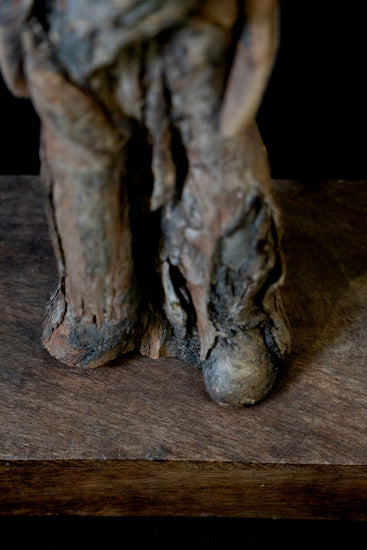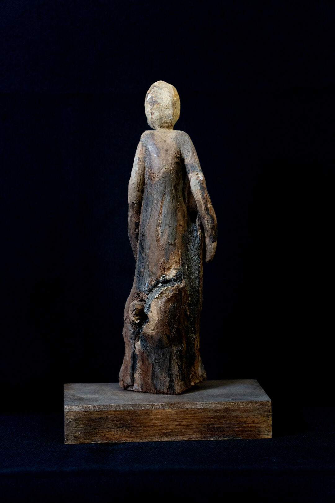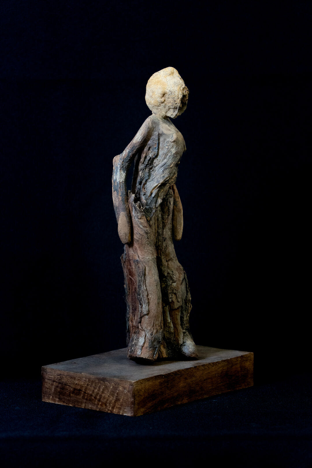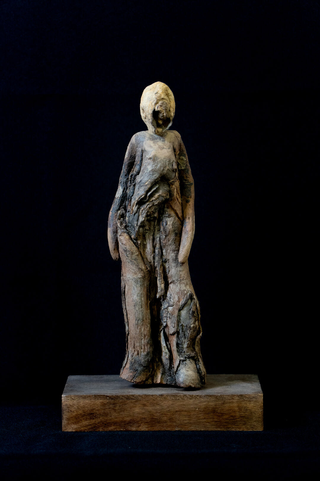 A soulful representation of humanity’s connection to the earth. The sculpture resembles a figure standing with quiet strength and dignity, crafted from wood that bears the natural textures and contours of bark. This piece captures a sense of timeless presence, as though the figure has emerged from the forest floor to watch over its surroundings. The organic shape and earthy tones emphasize the innate bond between human life and nature, inviting viewers to reflect on resilience and the silent wisdom found in nature.