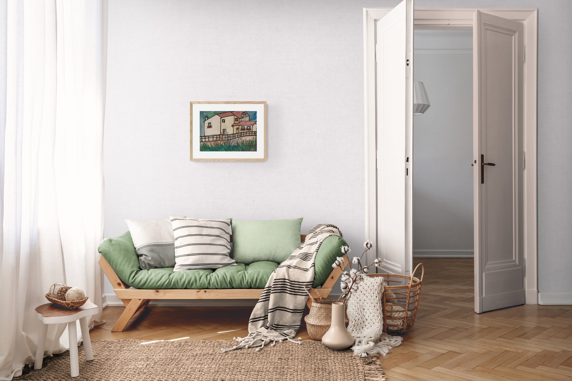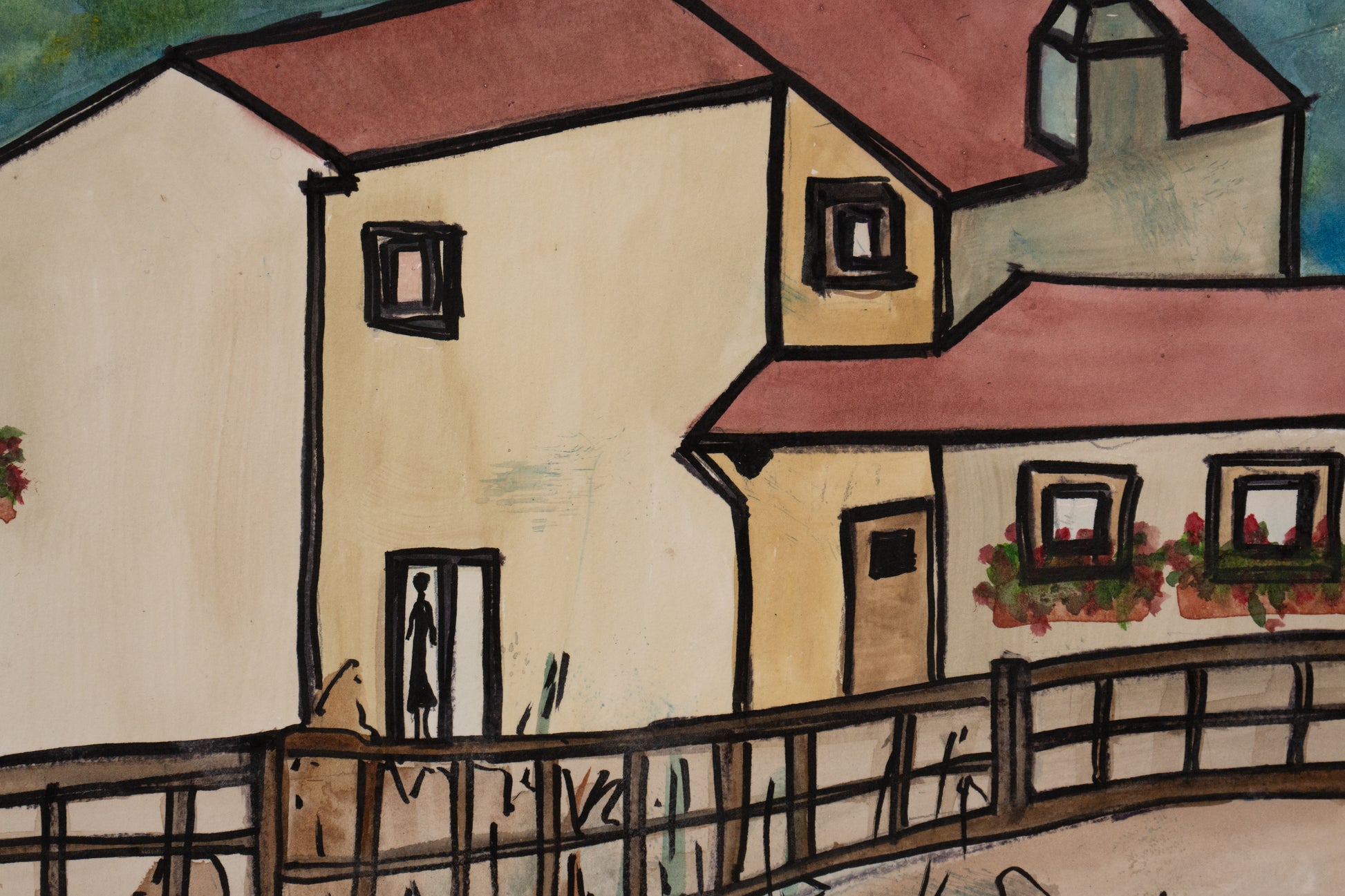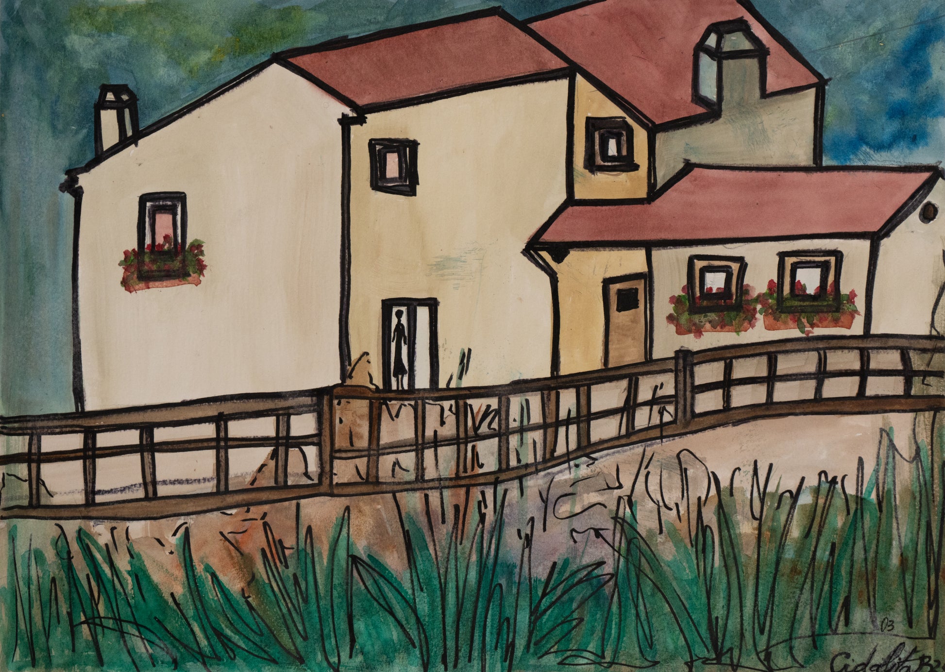 This artwork captures a quaint countryside house with a rustic charm. The simplistic architectural style and the vibrant green surroundings suggest a serene and harmonious rural life. The thick outlines and washed colors give it a dreamy, almost storybook appeal, inviting the viewer to imagine life within its walls.