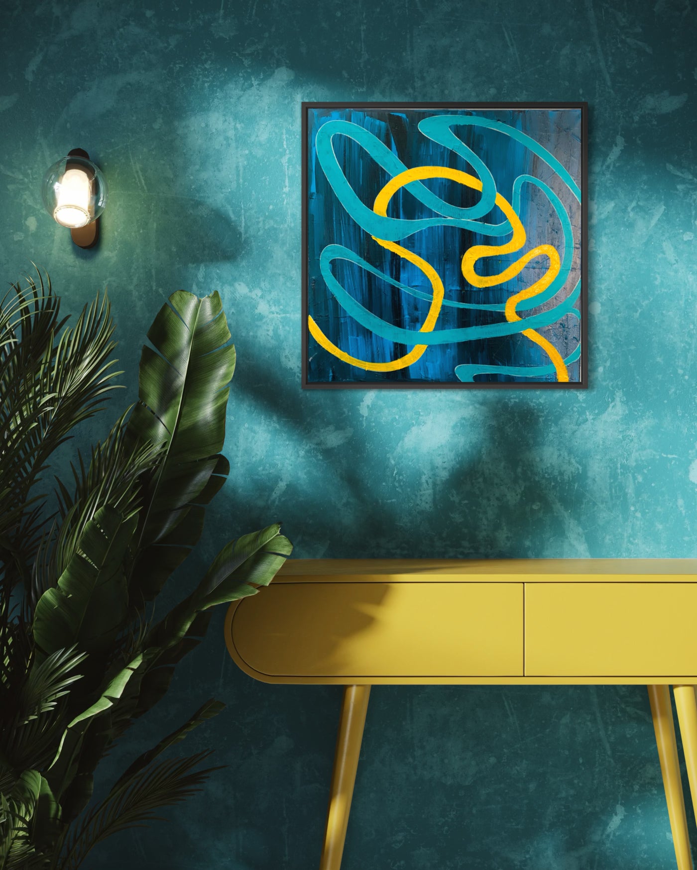 Energy in motion. “Electric Flow” captures the pulse of movement with intertwined ribbons of teal and yellow surging through a deep blue abyss.