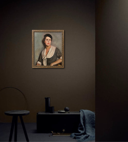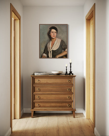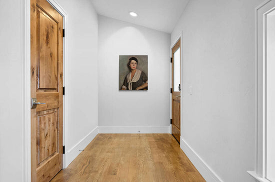 In "Elegance in Reflection," the artist captures a serene and contemplative portrait of a woman dressed in a vintage outfit. Her composed expression and poised demeanor are framed by the soft, muted background, emphasizing her timeless elegance. The subtle interplay of light and shadow highlights the textures of her clothing and the contours of her face, evoking a sense of quiet introspection.