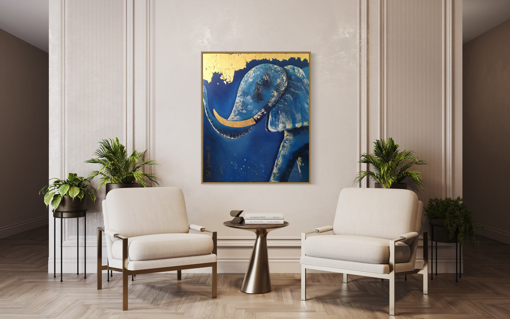 This painting showcases a bold, blue elephant, with rich indigo hues that envelop its form against a golden textured background.