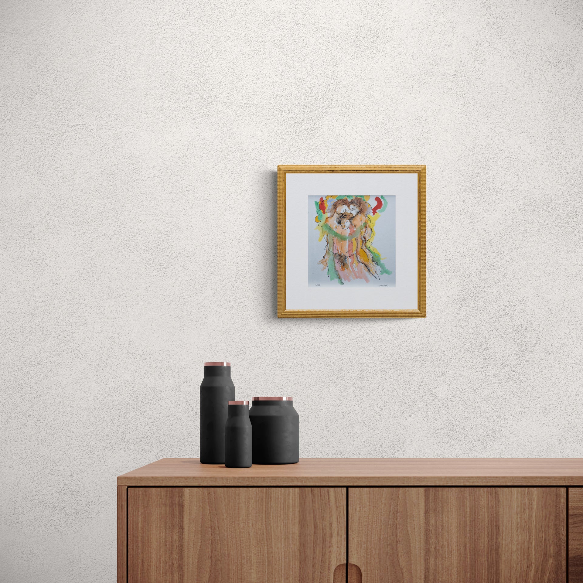 This painting captures three abstract figures in a close embrace, their bodies merging in a warm array of oranges and greens, with touches of red and yellow adding vibrancy. The composition is intimate, with the figures drawn in a loose, interconnected style that suggests unity and affection.