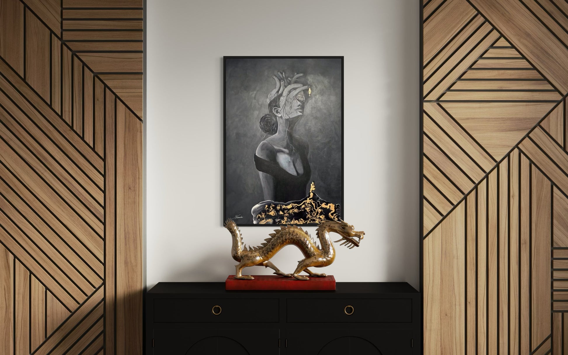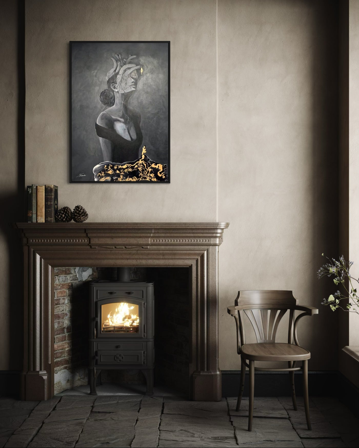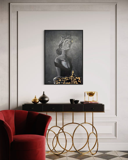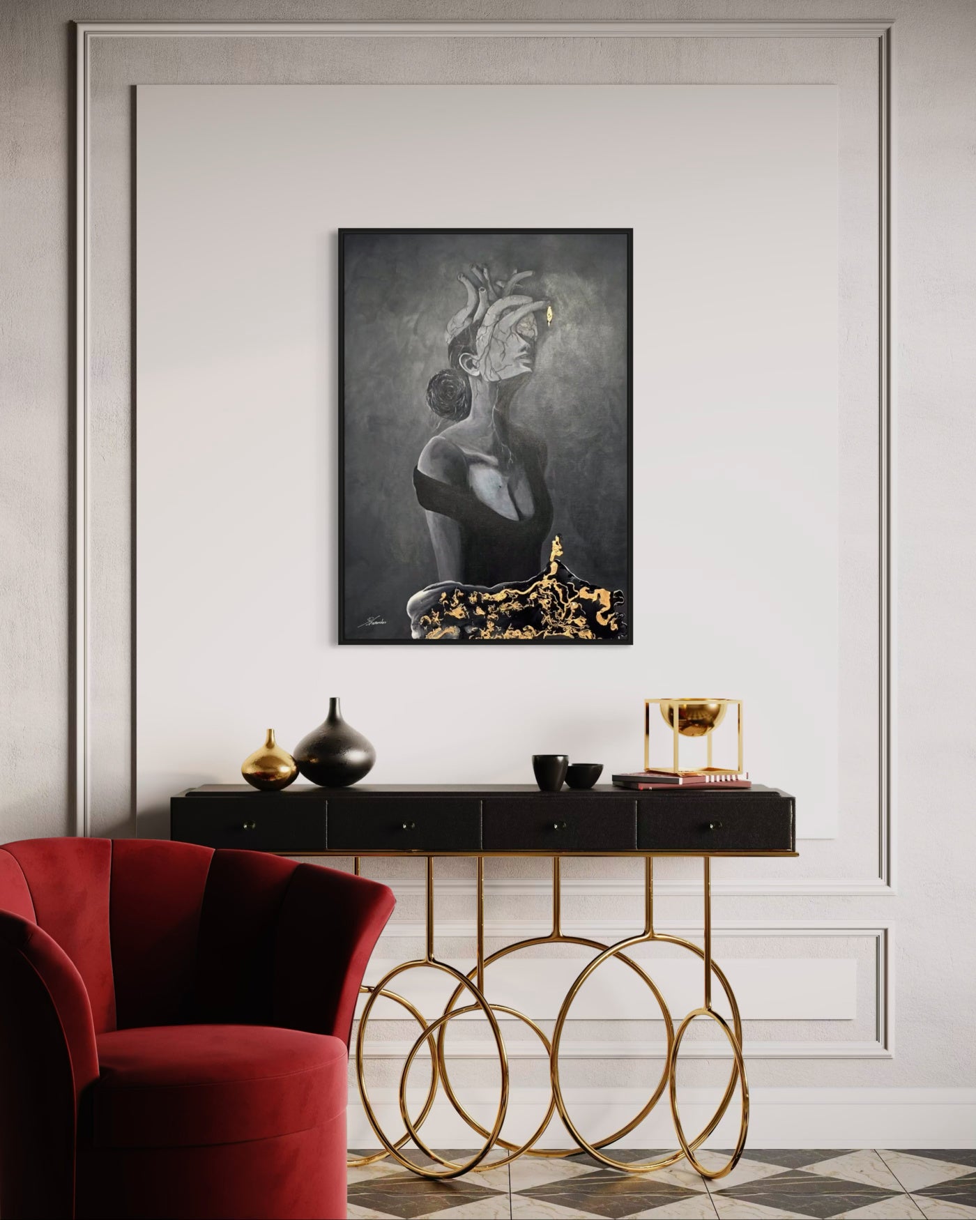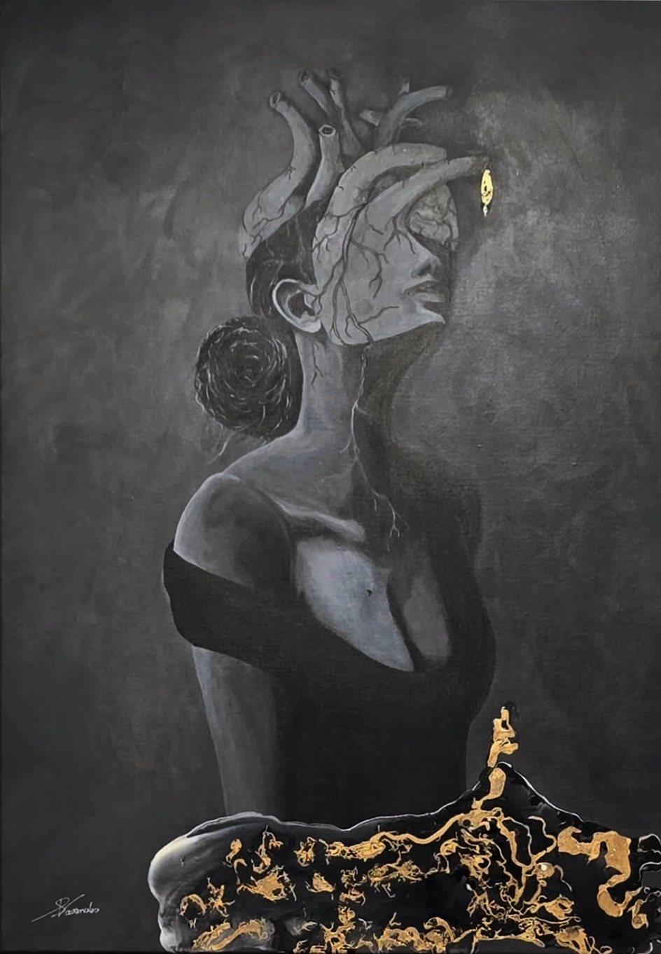 A hauntingly beautiful portrayal of a woman whose head is replaced by a heart — veins extending like roots, emotions bleeding into thought. In darkness, a single golden eye glows: a symbol of clarity, resilience, or revelation. A visceral tribute to the rawness of feeling.